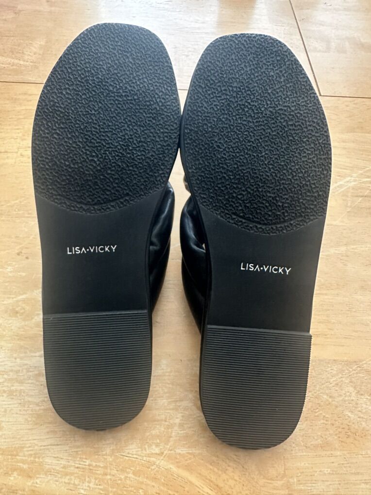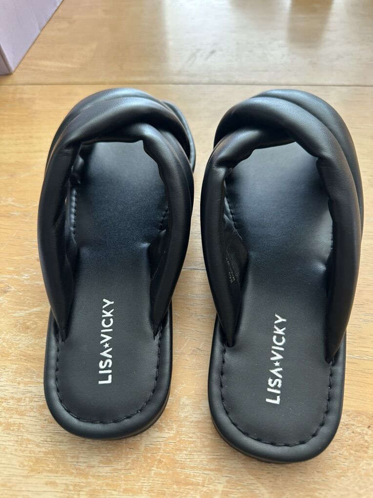 ApplePayNew, in box. Black leather slides, leather uppers.