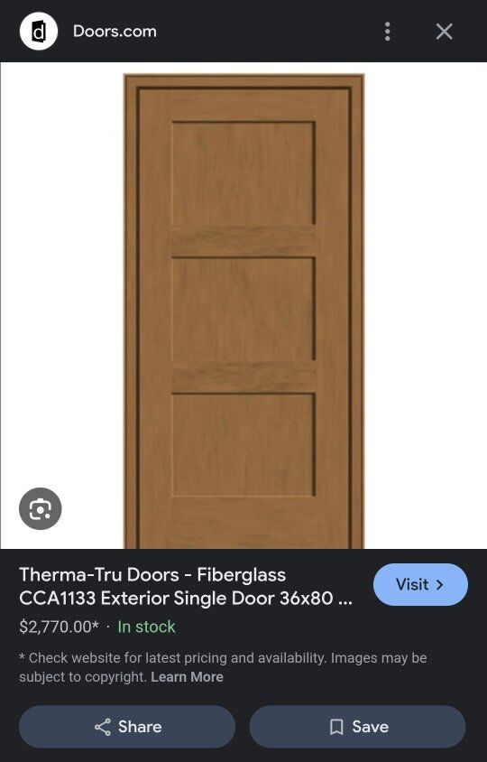Venmo3/0X6/8 Left Hand Stain Grade Fiberglass Therma-tru CCA1133 entry door hung on 6-5/8 Stain Grade Composite jambs. door was hung in the opening for about 2 weeks during construction. homeowner decided to get something with glass in it. it is in good shape and ready to be installed. I have included a link to the manufacturers website for any questions about this specific door. door measures 37-1/2"X81-5/8"