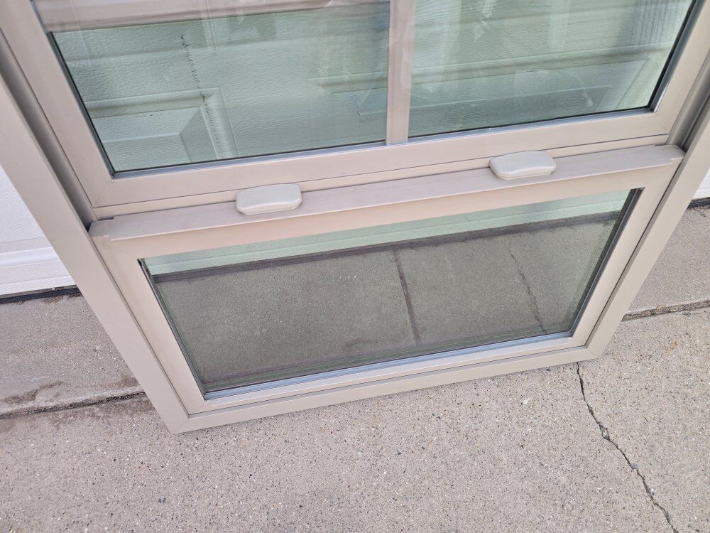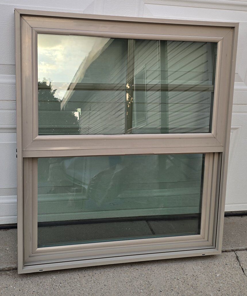 VenmoClay colored vertical sliding vinyl window with internal grids in the top pane. window measures 30"X34-3/4" it has the retrofit style frame that is 3-1/2" wide, would be great for a playhouse or shed.