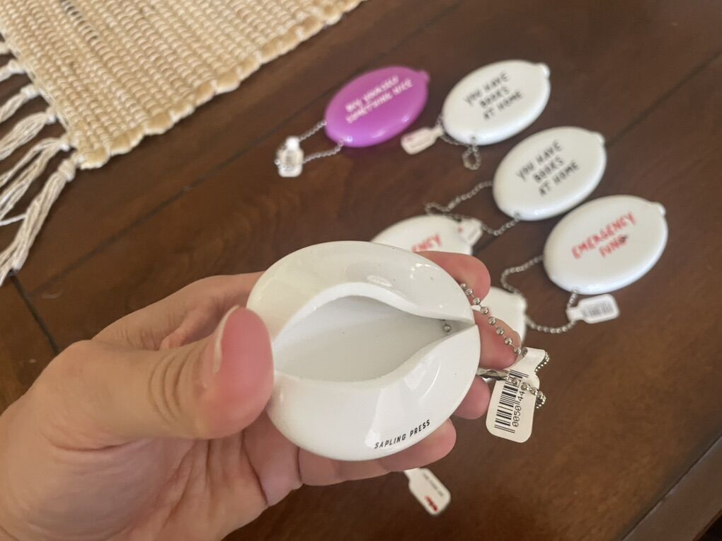 I have 7 new coin purses with funny sayings. They are kind of rubbery and open when you squeeze the ends. 4 say Emergency Fund with the last d crossed out. 2 say You Have Books At Home. 1 is purple and says Buy Yourself Something Nice. They are just over 8 inches long. They have ball chain on one end. The price tags show they were originally $8.95 each. I’m asking $2 each or take all 7 for $10. See my other ads for jewelry, artwork, home decor and more.