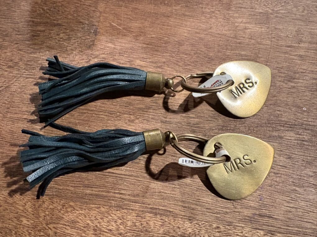 I have 2 new keychains with bronze colored rings, metal tags that says MRS. and gray leather tassels. The price tags show they were originally $11.95 each. I’m asking $3 each or take both for $5. See my other ads for jewelry, artwork, home decor and more.