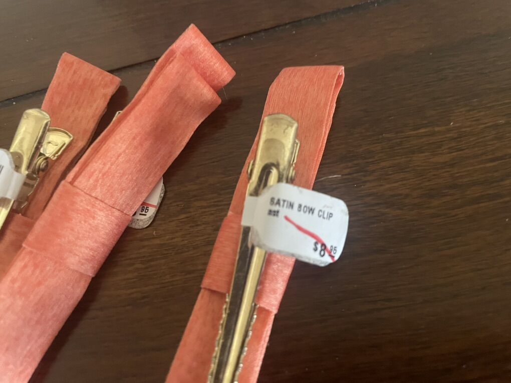 I have 3 new coral colored satin bows in large alligator hair clips. They are 4 inches long. The price tags show they were originally $8.95 each. I’m asking $2 each or take all of them for $5. See my other ads for jewelry, artwork, home decor and more.