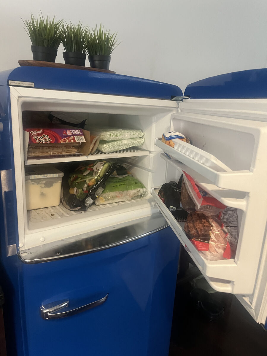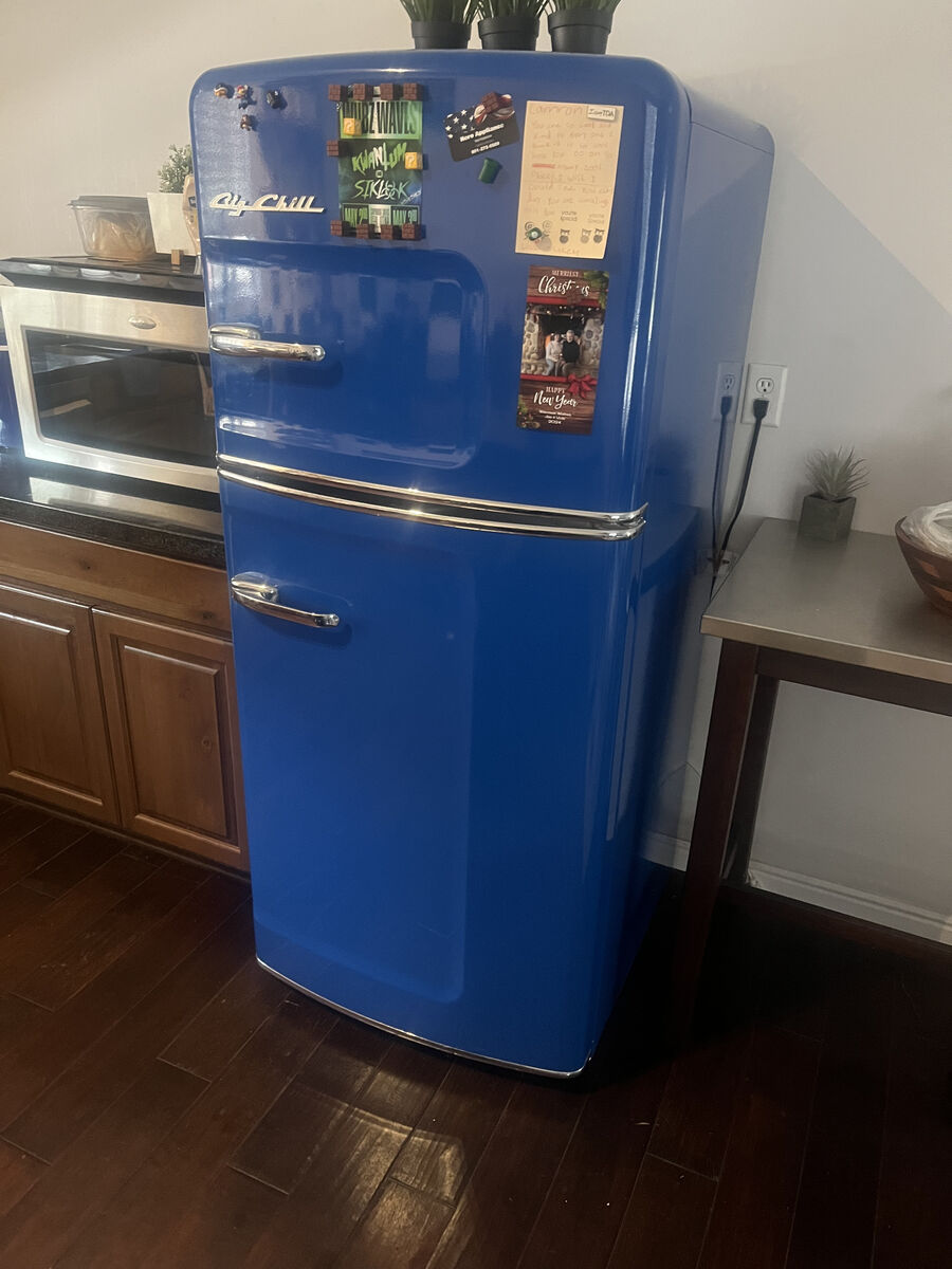 VenmoRetro Blue Big Chill Studio Fridge - 28” Wide, Vintage Style! For sale: Eye-catching Big Chill Retro Studio refrigerator in vibrant blue. This compact 28-inch wide model brings 1950s charm to any kitchen while fitting perfectly in smaller spaces. Features a top-mount freezer, adjustable glass shelves, crisper drawers, and plenty of door storage. It’s in excellent used condition—no dents, scratches, or mechanical issues, and it runs quietly and efficiently. We’ve enjoyed its fun retro vibe, but we’re making room for a larger appliance. Details: • Model: Big Chill Retro Studio (28” width for tight spots) • Dimensions: Approximately 28” W x 68” H x 31” D • Capacity: About 14 cu ft total (ample for a family or apartment) • Color: Bold blue with chrome handles and trim • Extras: Energy Star rated, frost-free, from a smoke-free, pet-friendly home. Cleaned and ready to go!