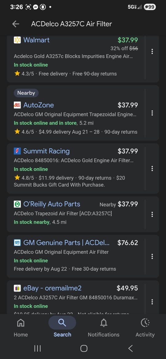 Chevrolet ACDelco OEM AIR FILTER GM Part #84850016 AcDelco part #A3257c Trapezoidal filter, 2017-2019 GMC Sierra 3500 2017-2019 Duramax new in box never installed