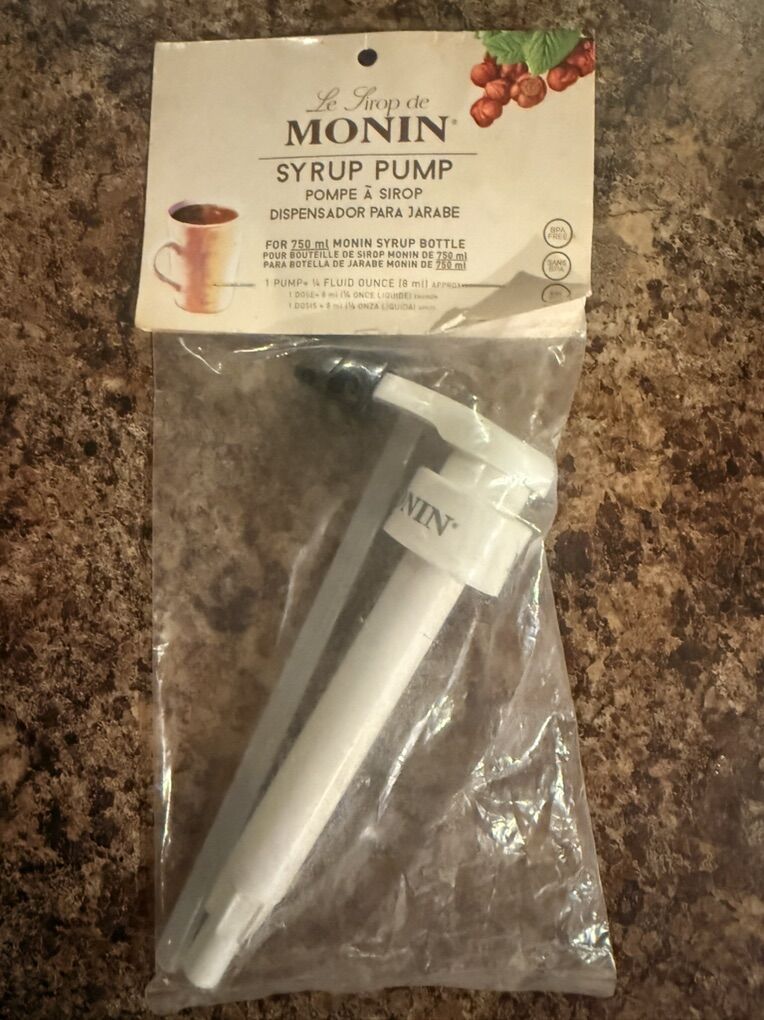 VenmoMonin Syrup Pump designed for 750 ml Monin syrup bottles. This pump dispenses approximately 1/4 fluid ounce (8 ml) per pump. It is specifically designed to fit Monin's 750 ml glass syrup bottles. The pump is also compatible with Monin's 1-liter PET bottles, although the image primarily references the 750 ml size.