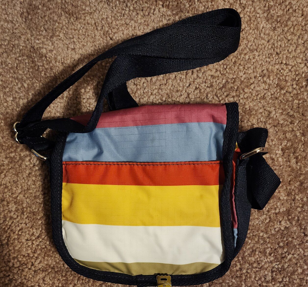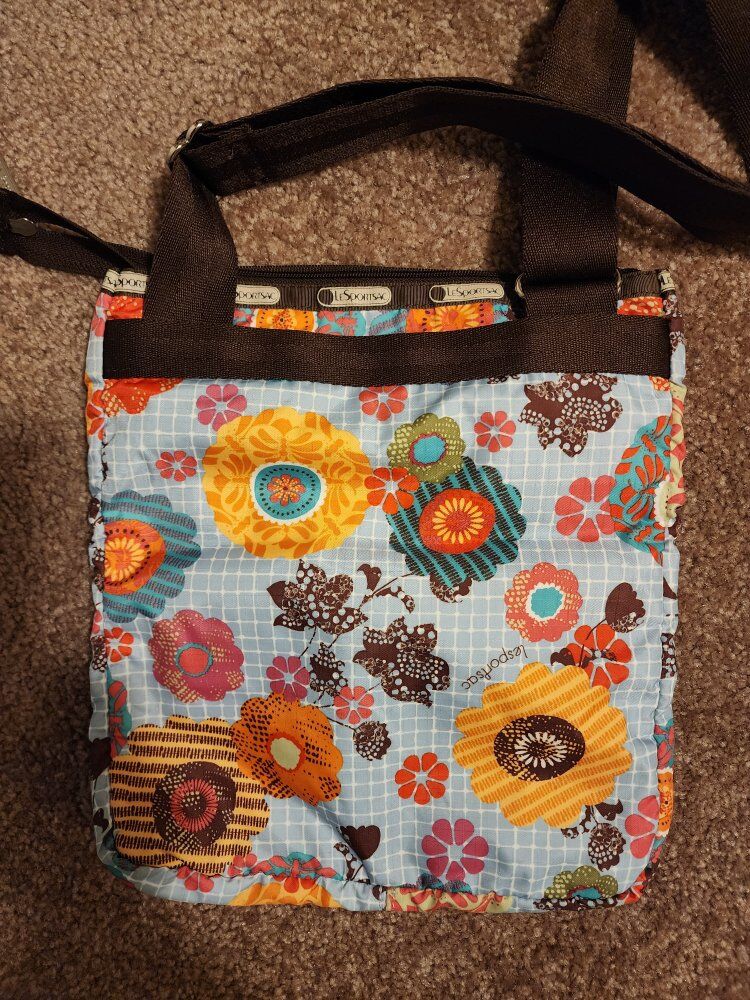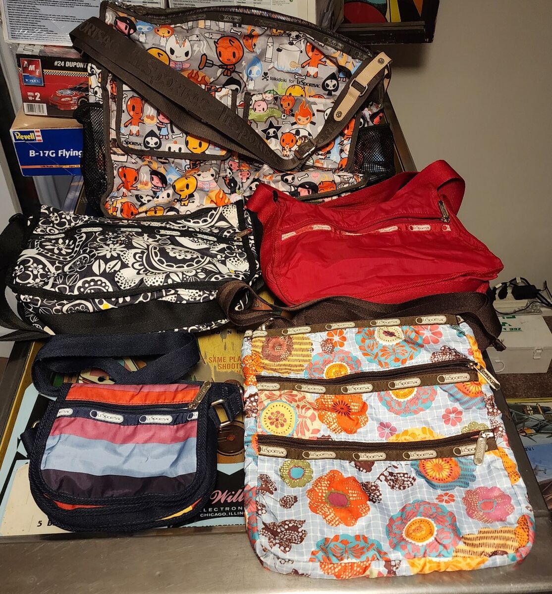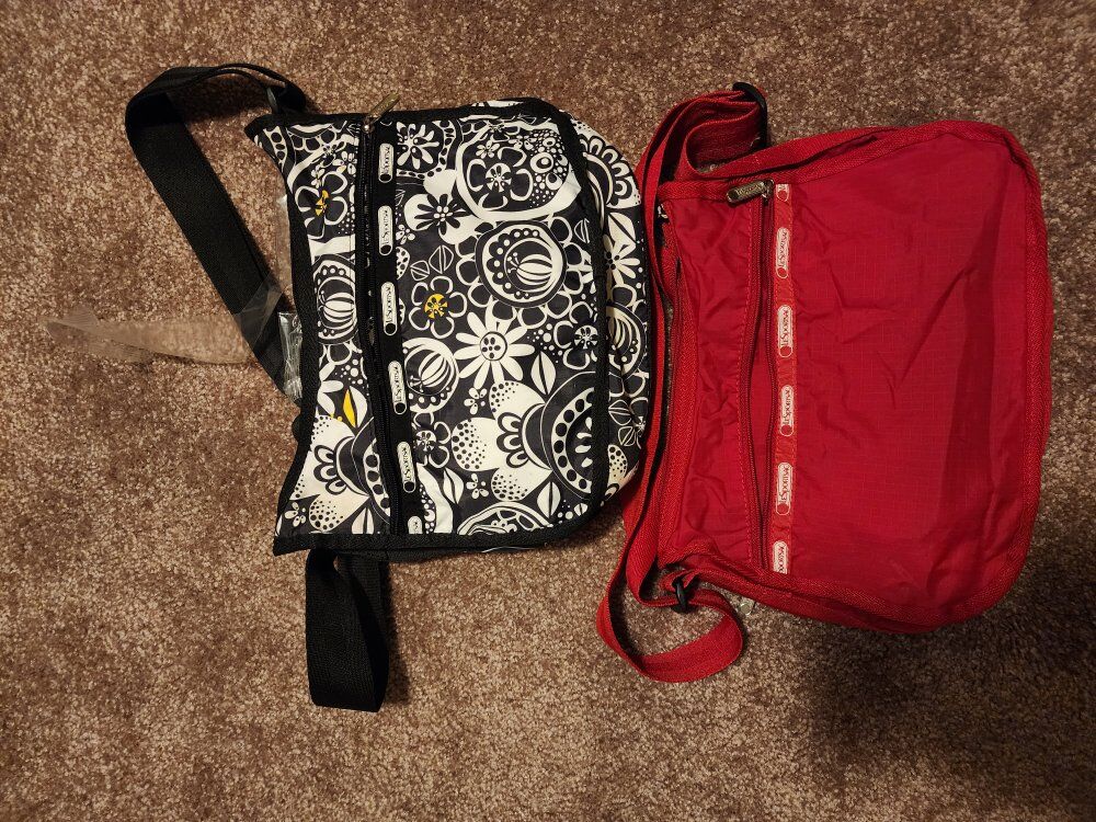 Red nylon every day crossbody. Zip closure. Black and white nylon every day crossbody. Zip close. The above are 9 x 12.75 x 5 inches. Multi color flowered, 3 Zip compartments. Appx. 10 x 11 inches Large Nylon multi color tokidoki pattern. has zippered pouches and open pouches and mesh pockets on sides. Appx. 13 x 15 " Small nylon multiple color striped magnetic closure with Zip pocket on outside and divided inside. Appx. 6 x 6 inches. $10 each.