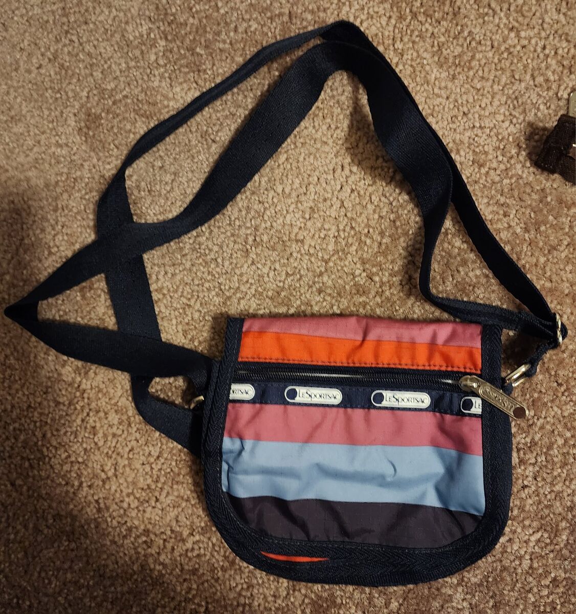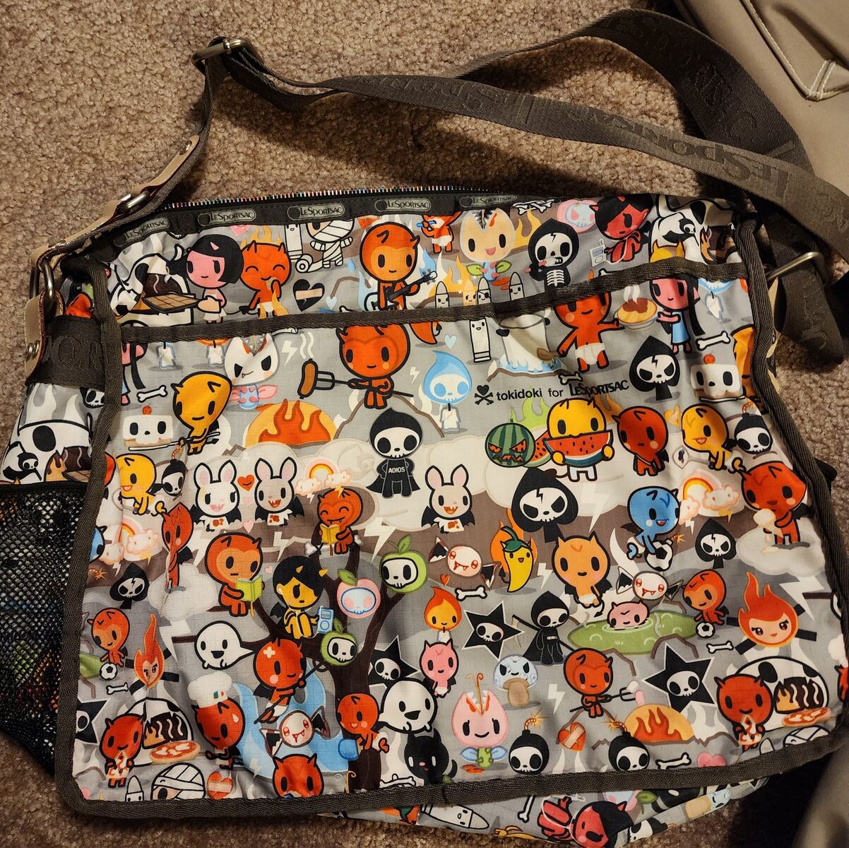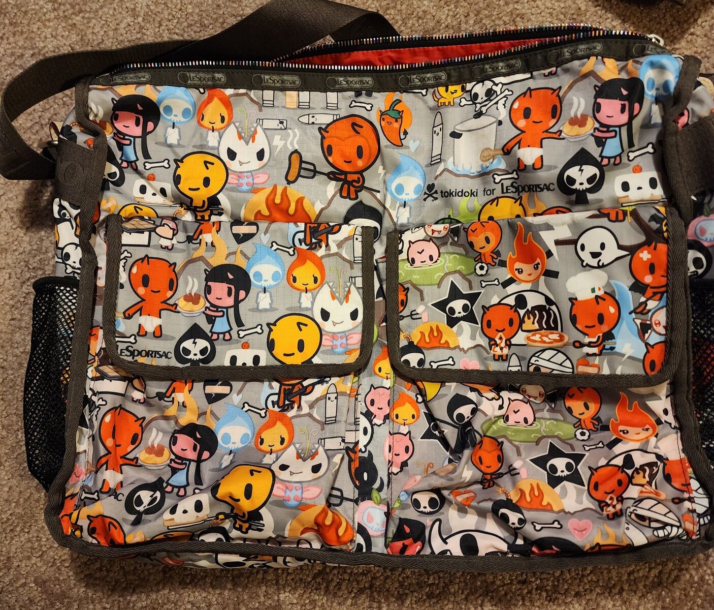 Red nylon every day crossbody. Zip closure. Black and white nylon every day crossbody. Zip close. The above are 9 x 12.75 x 5 inches. Multi color flowered, 3 Zip compartments. Appx. 10 x 11 inches Large Nylon multi color tokidoki pattern. has zippered pouches and open pouches and mesh pockets on sides. Appx. 13 x 15 " Small nylon multiple color striped magnetic closure with Zip pocket on outside and divided inside. Appx. 6 x 6 inches. $10 each.