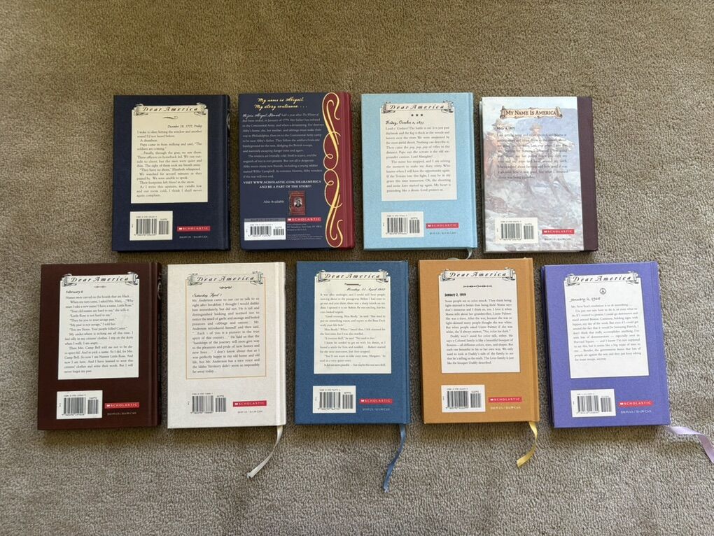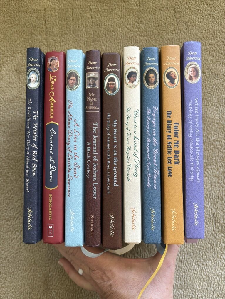 9 Dear America Books from the beloved historical fiction series for children (by various authors): The Winter of Red Snow, Cannons at Dawn, A Line in the Sand, The Journal of Joshua Loper, My Heart Is on the Ground, West to a Land of Plenty, Voyage on the Great Titanic, Color Me Dark, and Where Have All the Flowers Gone? Scholastic, published 1996-2011. Hardcovers (most with ribbon bookmarks) in very good to excellent condition. Text only. Cash or Venmo. Discount on multiple items.