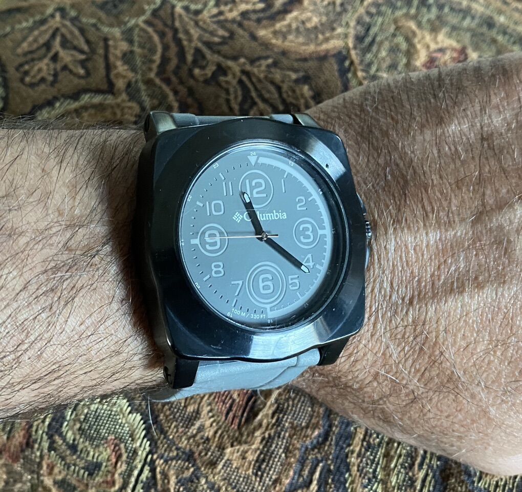 Grey Columbia analog wristwatch. It’s called the Men’s Commuter Travel Watch, model CA012. Water resistant to 100 meters. Battery is dead. Cash only. Pick up near downtown Salt Lake City. Cash only.