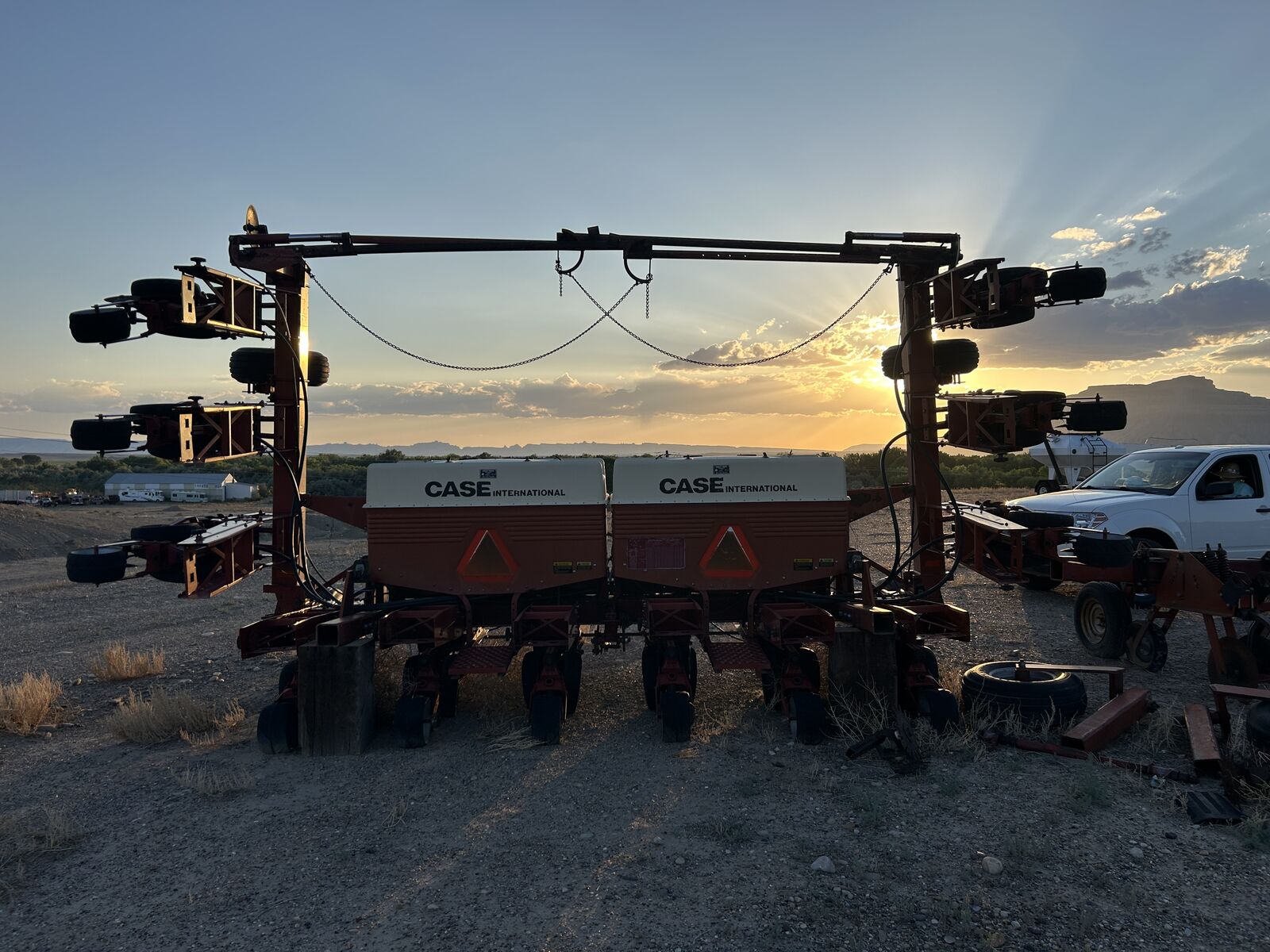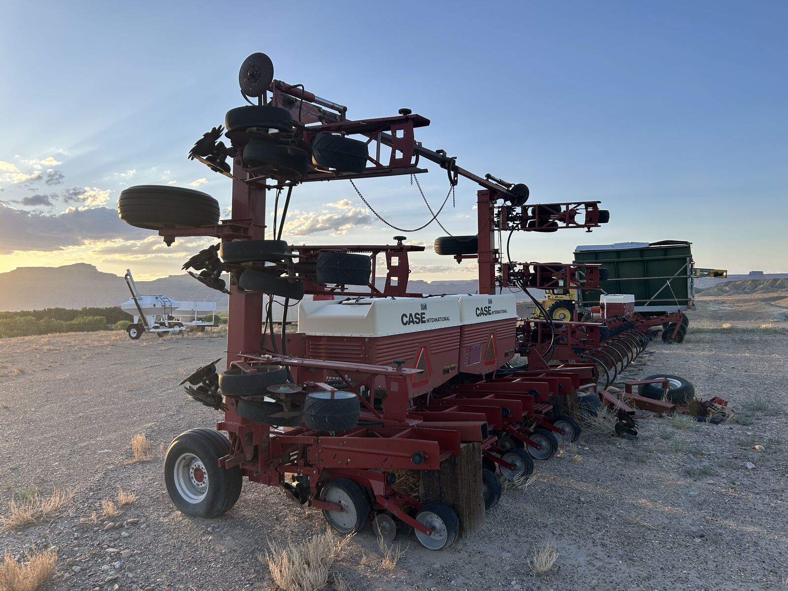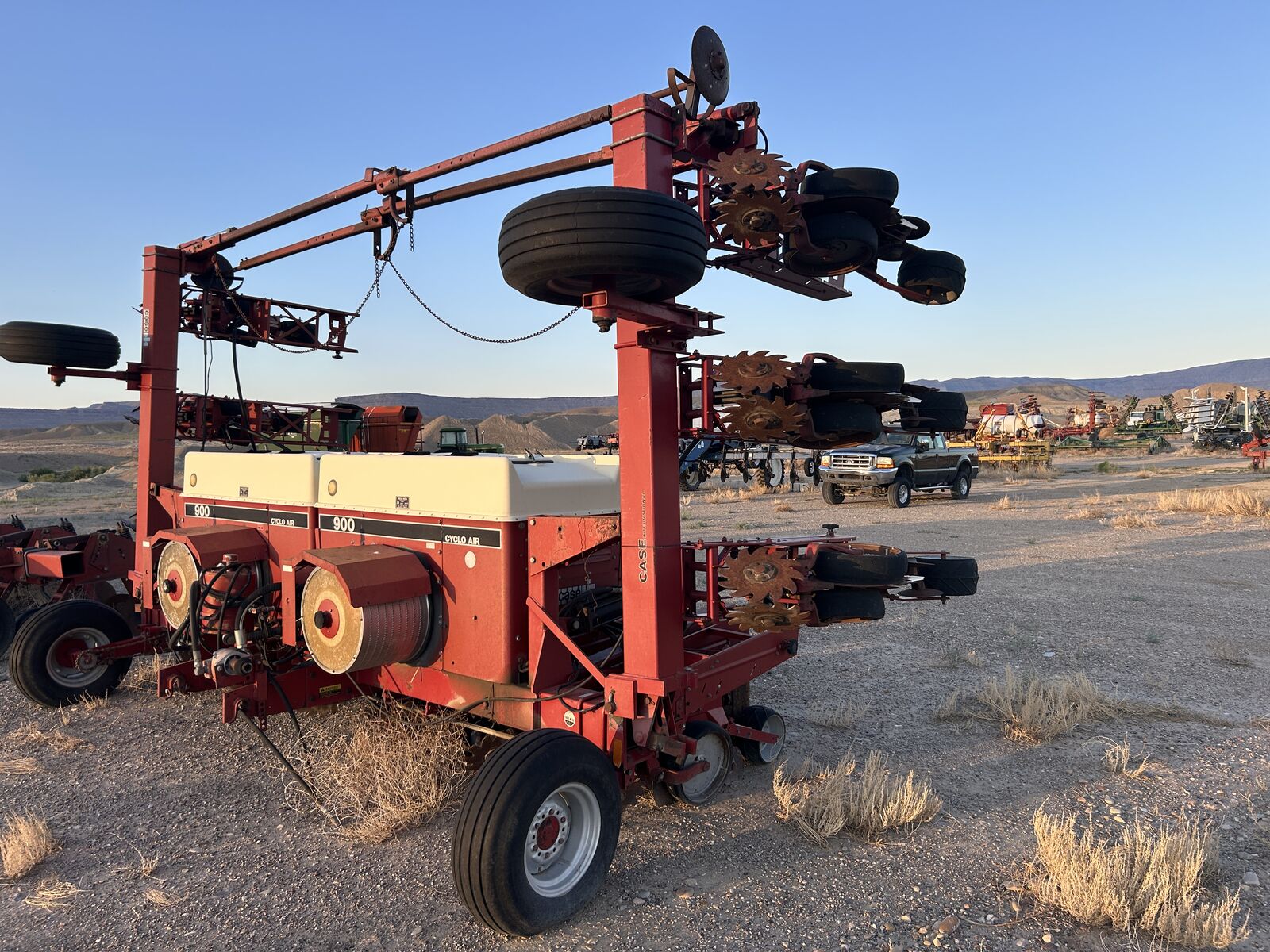 Case IH 900 Cyclo Air planter, Width: 28', 9 Row, 30" spacing, Three Point Hitch, Hydraulic Folding, Bulk fill system, Mechanical Drive, Spring Down Pressure, Finger Coulters, Double Gauge wheels, Double Closing Discs, Rubber Compaction Wheel. Needs various repairs and rear wheels welded back on. Asking $3,800.00 - Located in Green River, Utah