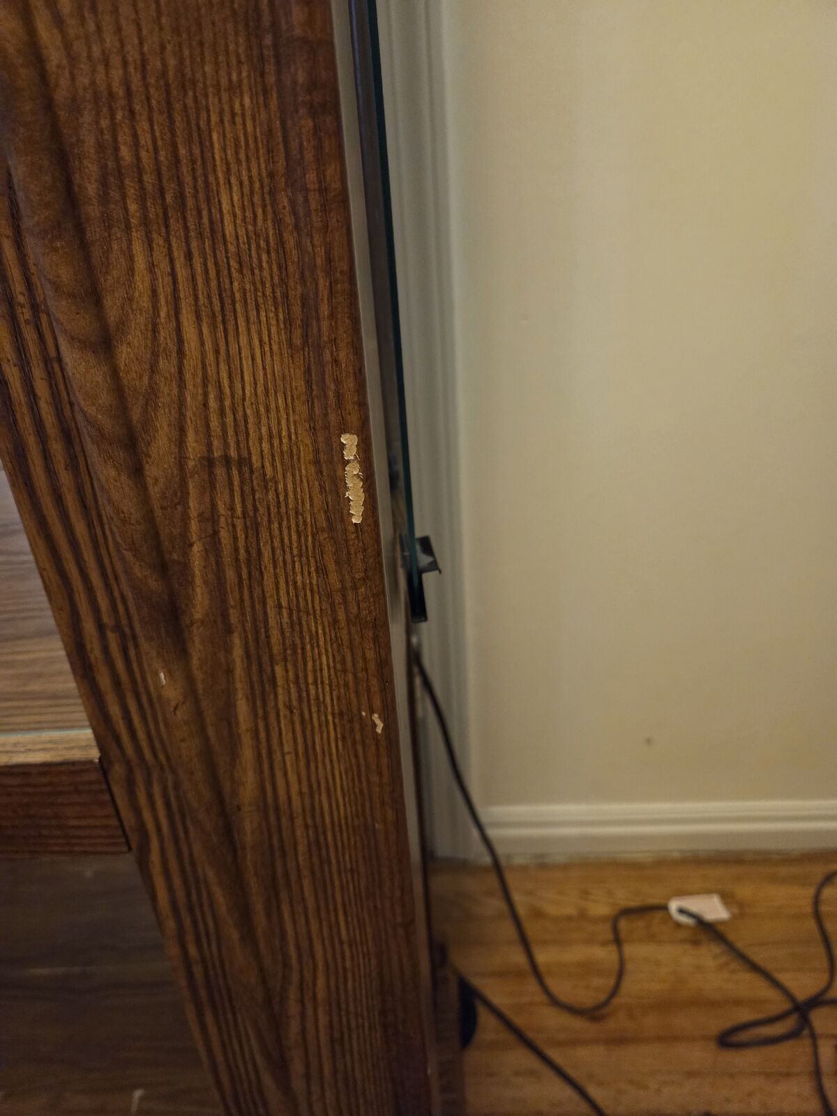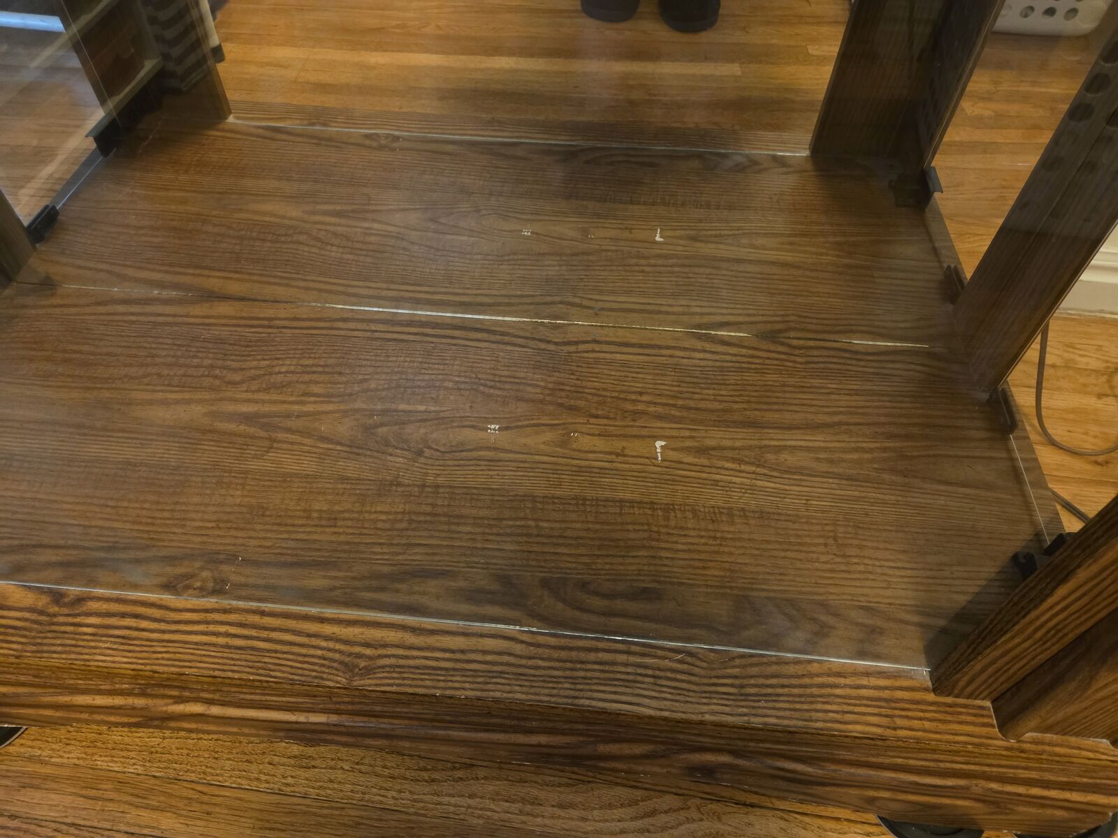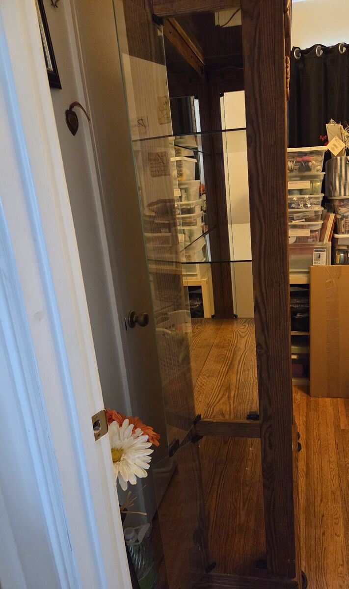 Heavy wood hutch. Some minor cosmetic damage from moving. Shelves in middle are adjustable, comes with 2 glass shelves and replacement shelf.