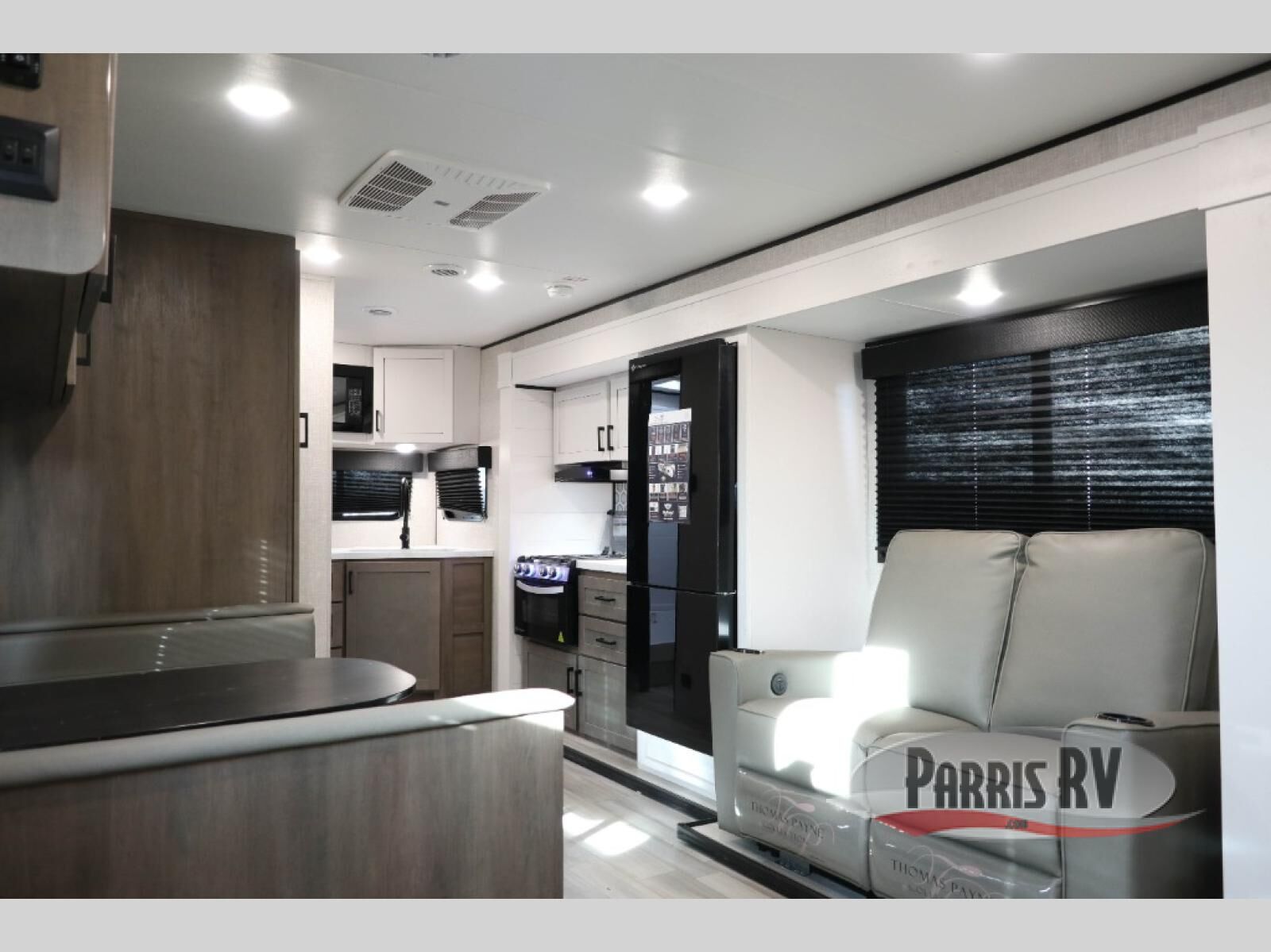 Each camping trip in this travel trailer is sure to bring great memories. You will love having your own bedroom up front with a walk-around bed and dual wardrobes to keep your things organized. The privacy curtain here will be appreciated if you have a guest or two sleeping over on the booth dinette. You'll find theater seating with tables within the large slide out, along with a three burner cooktop and 10 cu. ft. 12V refrigerator. A spacious pantry lets you pack snacks for the whole weekend, and the full bath will keep everyone squeaky clean!