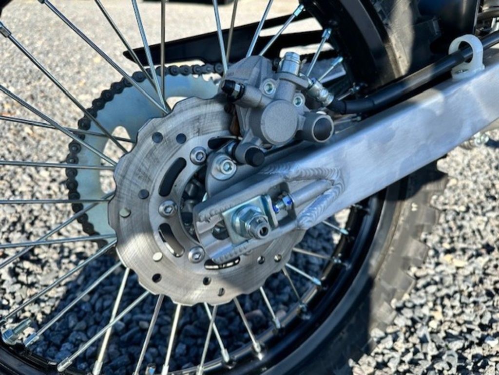 Front and rear disc brakes provide strong progressive stopping power. The 220mm front petal disc with a dual-piston caliper is complemented by a 186mm rear petal disc with single-piston caliper, inspiring confidence on the trails.