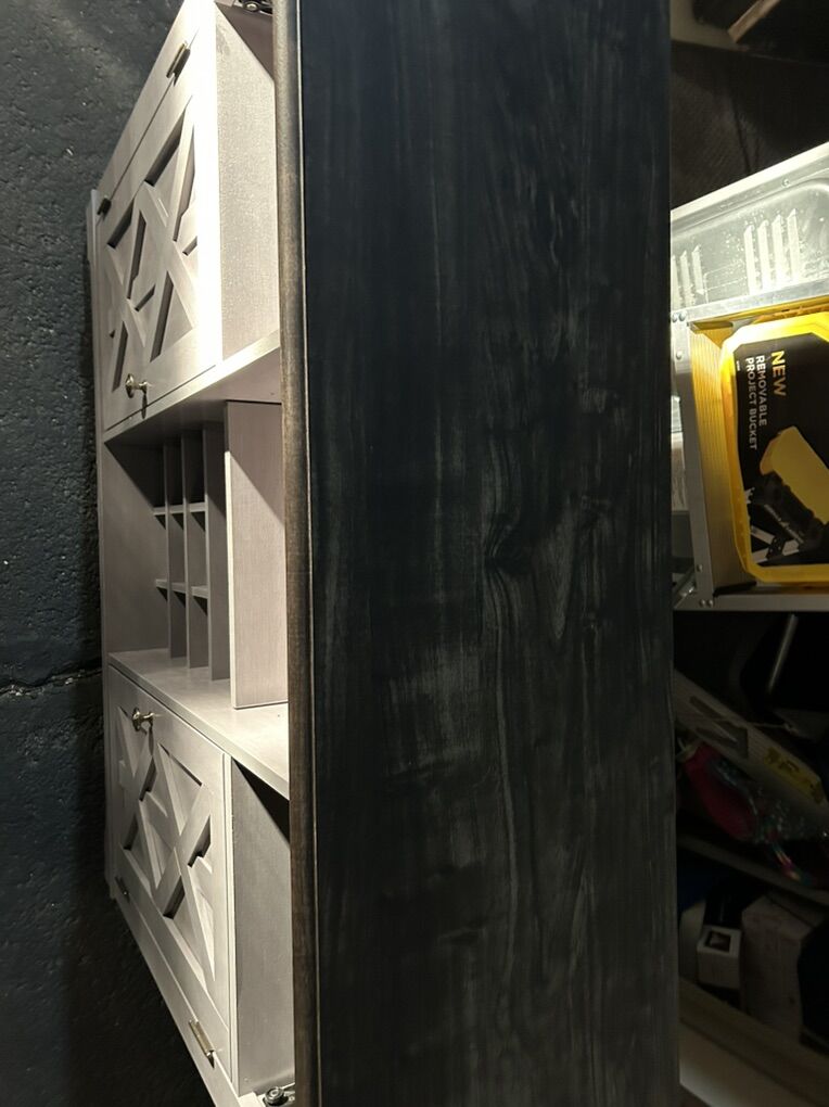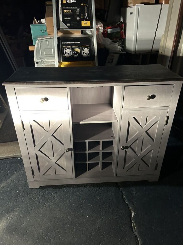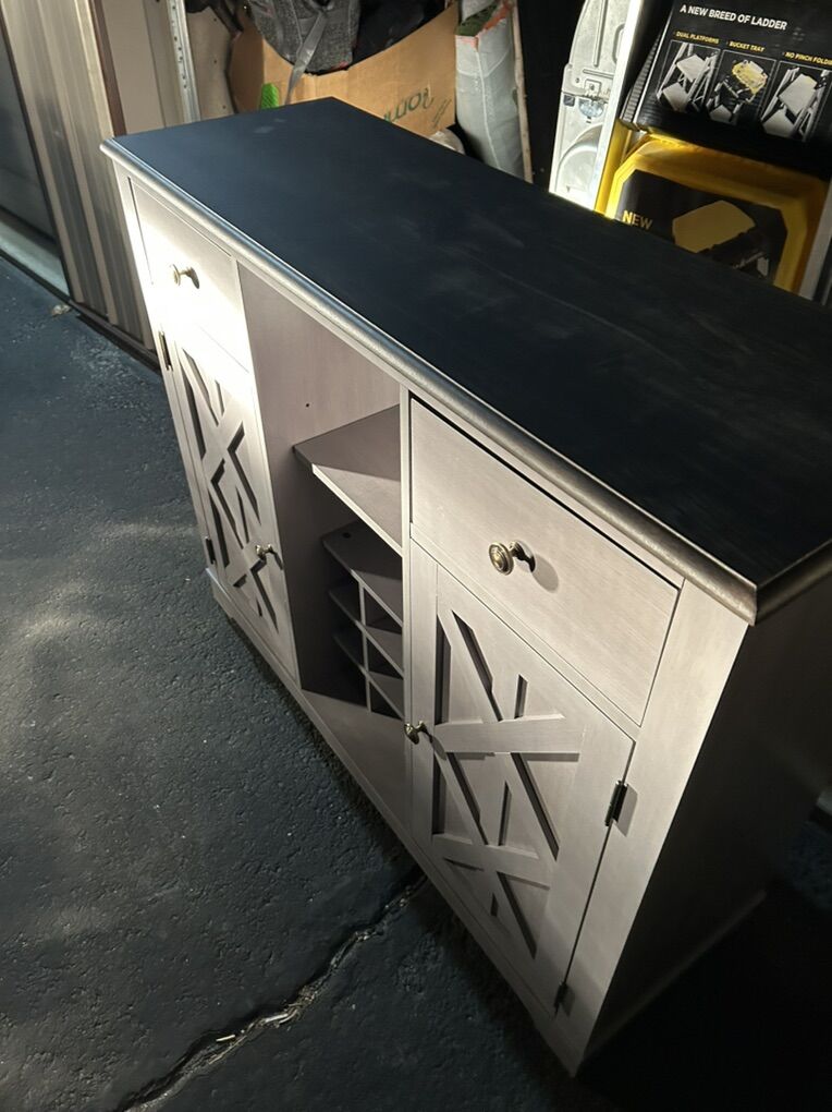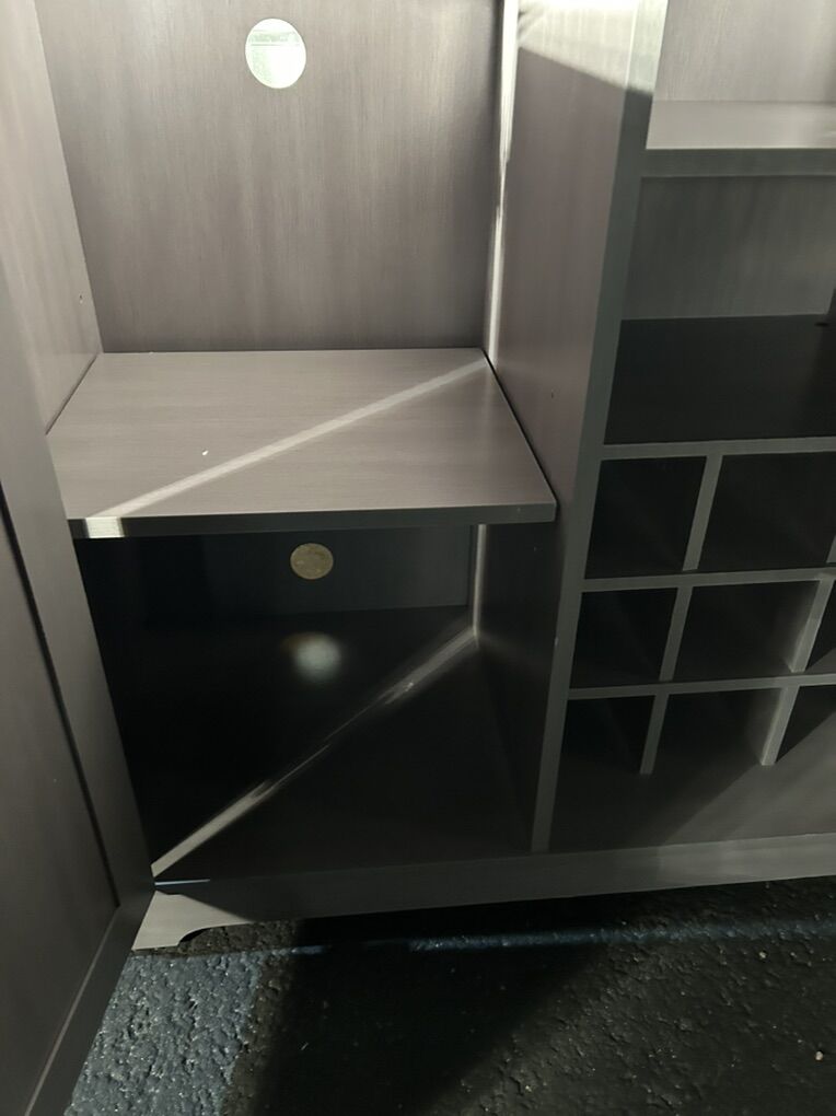 CashAppClassy, modern wine cabinet. 1 yr old. Great condition. Holds wine bottles, and liquor in side cupboards, shaker, mixers, etc in other cupboard. Bottle opener, rocks glasses in drawer. Wood slips for wine glasses to be held on display upside down above the wine rack. Multi-use. Comes with 4-6 martini glasses.