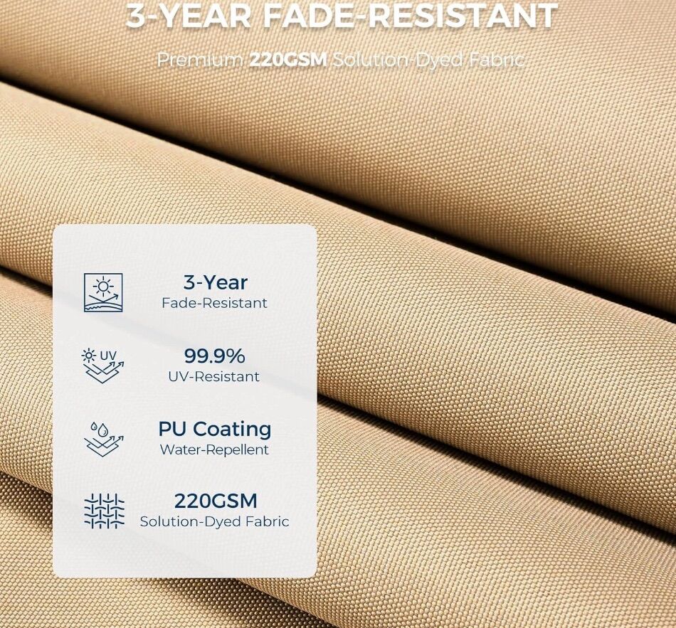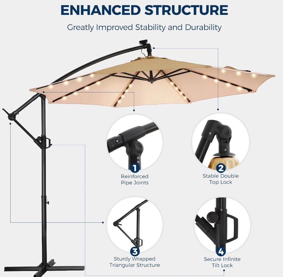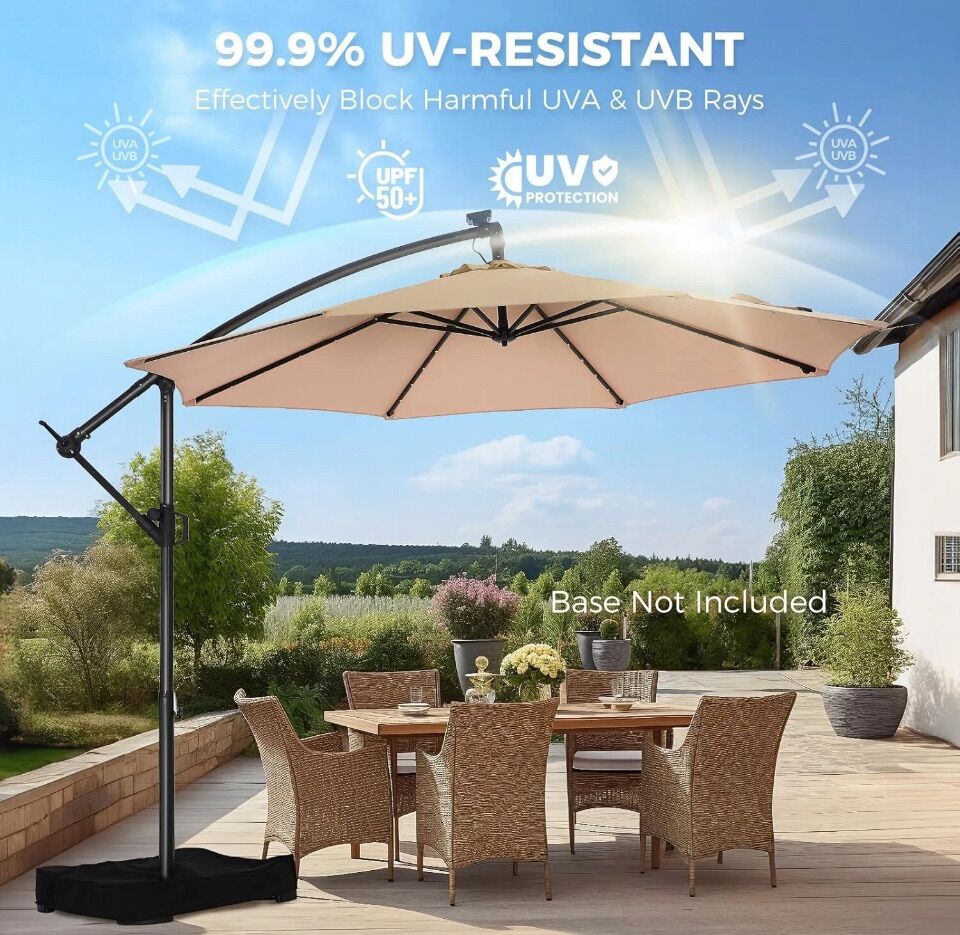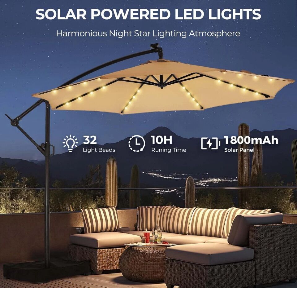 Color Beige Shape Round Material Metal Power Source Solar Powered Brand HOMSHADE Style Classic 10FT SOLAR-POWERED UMBRELLA: The solar-powered high-efficiency 1800 mAh rechargeable energy panel on the top of the pole continuously provides energy for 32 lamp beads day and night. Perfect lighting and comfortable atmosphere all year round, covering a large 10FT outdoor home area. [Notice]: Before using the solar light, please open the top solar panel and connect the wires first PREMIUM CANOPY: High-quality 10ft 220gsm solution-dyed fabric with UPF50+ anti-UV coating provides 3-year fade-resistant, 99.9% UV-resistant, and water-repellant properties. Provides a 10FT larger shaded area. Effectively blocks harmful UV rays including UVA and UVB to protect your health HIGH-QUALITY FRAME: Durable 8-rib steel alloy frame with a 1.9-inch umbrella pole. 8 heavy-duty sturdy ribs are 20% thicker(18x12mm), providing superior umbrella surface support and balance to reduce shaking. Can withstand 30 MPH Wind-Resistant. Double powder-coated steel alloy surface brings excellent rust resistance ENHANCED STRUCTURE: The strengthened structure integrating 4 major upgrades is more durable and reliable: stable double top lock, secure infinite tilt lock, reinforced pipe joints, sturdy wrapped triangular structure EASY CRANK/TILT ADJUSTMENT: Smooth crank system ensures that opening (clockwise) and closing (counterclockwise) the patio umbrella can be easily accomplished in seconds. Infinite tilt adjustment within 45° ensures that the shadow is always in the desired position VENTS AND TIES: Top vents allow rising hot air to flow out freely, allowing cool crosswinds to continue blowing in, and the smooth air path adds extra stability against strong winds. Ties on the umbrella provide extra secure storage and protection for folding umbrellas NICE OUTDOOR OUTLOOK: HOMSHADE 10ft classic offset patio umbrella can greatly add color, cool shade, and cozy atmosphere to your patio and outdoor creative spaces. Suitable for a variety of outdoor environments such as patios, gardens, pools, decks, backyards, and so on USE AND MAINTENANCE: The 10ft offset hanging umbrella needs to be used with proper patio weights. (Cross bar included, weight base not included.) Please search B0CNCY282R. Please close the patio umbrella and tie it with the strap to keep it in optimal condition and extend its service life in extreme weather such as strong winds or when not in use