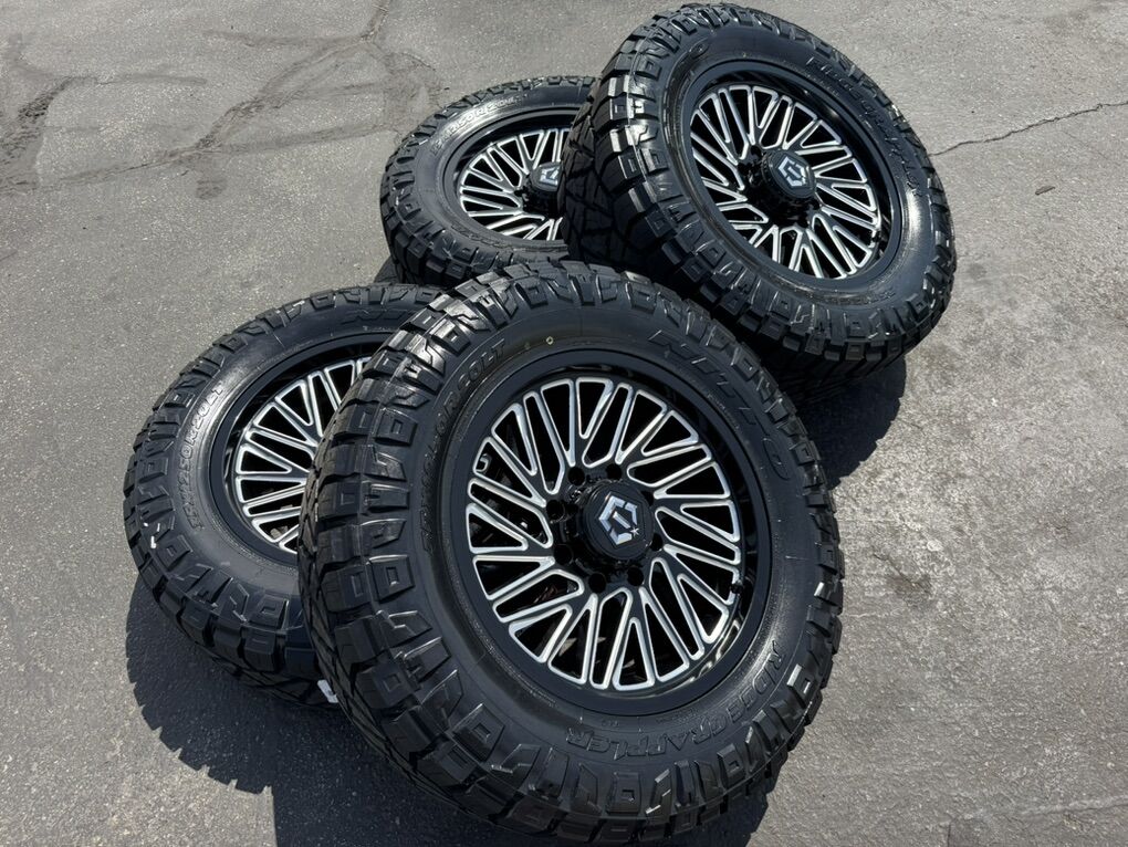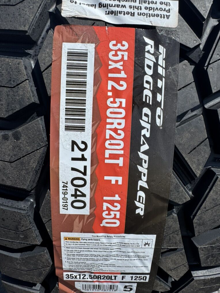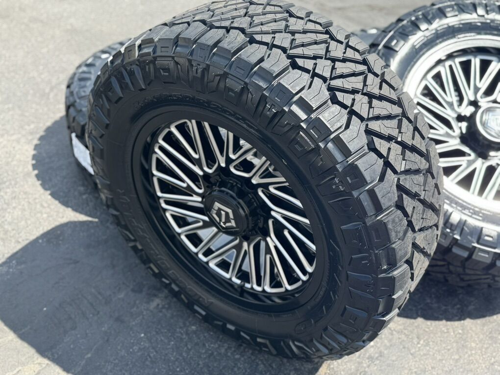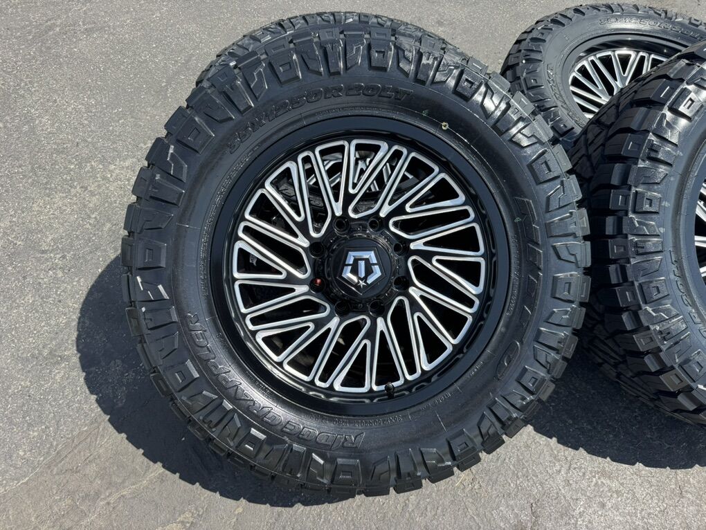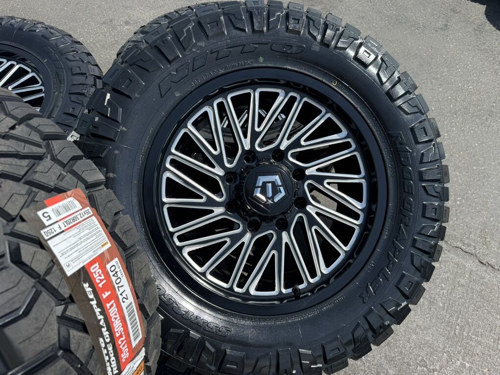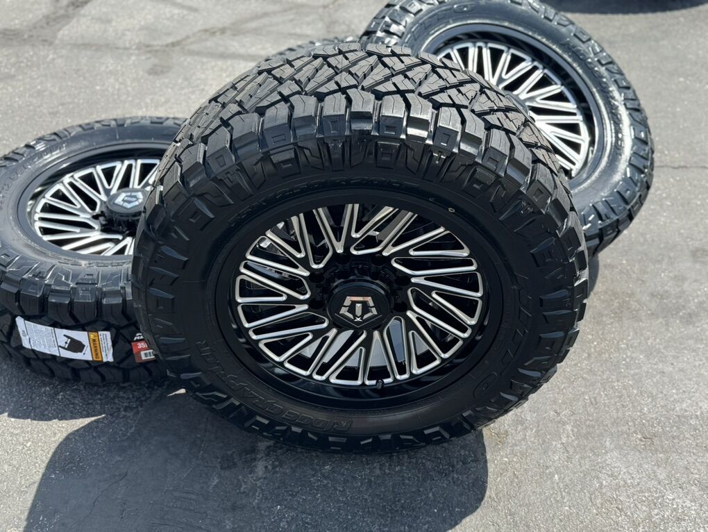 35x12.50r20 Nitto Ridge Grappler Load F 12 ply mounted and balanced on 20x9 TIS 553BM 00et offset. 8x180 bolt pattern, these fit 2011 and newer chevy silverado and gmc sierra duramax trucks. Huge savings!