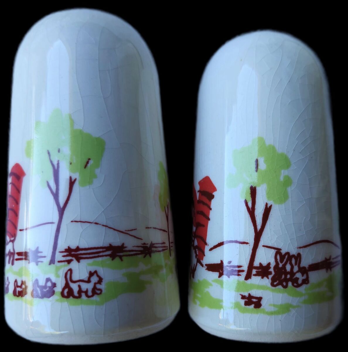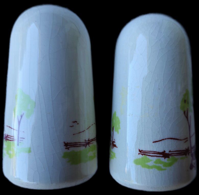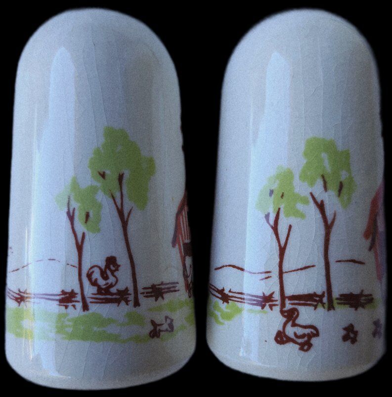 VenmoVTG Carter Hoffman Barnyard/Farmhouse Ceramic Salt/Pepper Shakers AUTHENTIC Signed/backstamp by artist 1950s. This set was always displayed in a china cabinet only. "Original rubber plugs." EUC no chips, or cracks for age and environmental factors; over time, changes in temperature, humidity, and moisture can cause a piece to craze, especially with "vintage or antique items." $25 *Yes you can find others for less without plugs, they have used wear scars, ceramic flaws or marks.