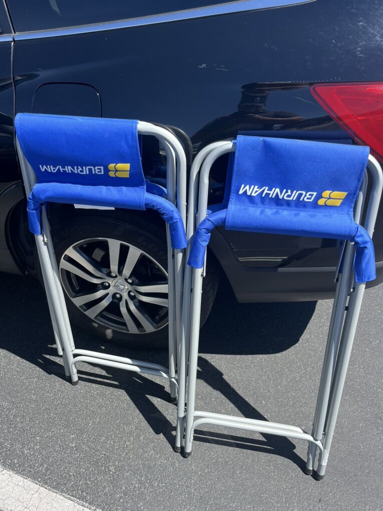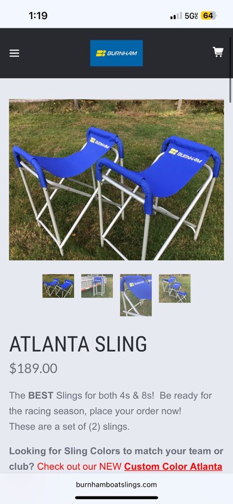 Atlanta Slings (https://burnhamboatslings.com/custom-color-atlanta-sling/). Durable yet light, these slings have anodized aluminum tubing, stainless fasteners, a rugged support cradle and strong, thick support brackets. The cross bar is supported by the upright-post instead of the hinge mechanism unlike similarproducts. Burnham Boat Slings fold flat. These slings are ideal for supporting eights and fours. Size: 35.5 tall. Sling opens 24.0 wide & 10.0 deep to support eights or fours.Imported. Set of (2) Slings.