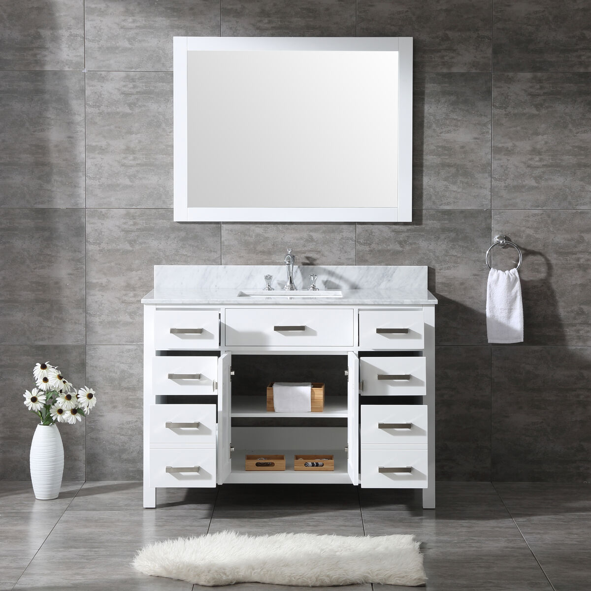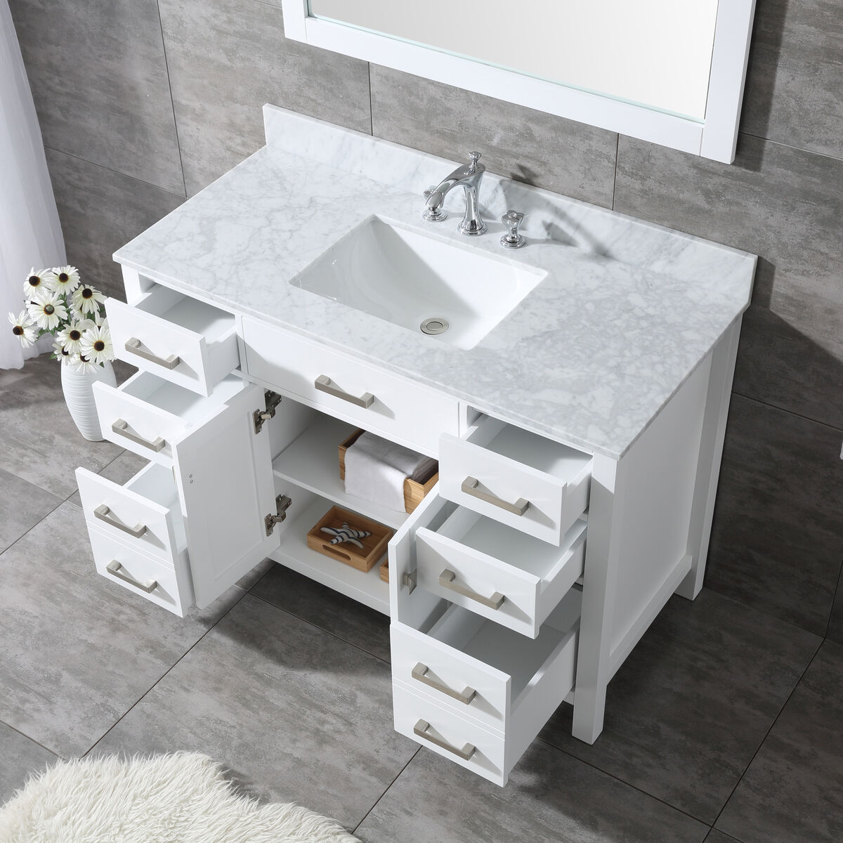 48 inch vanity in WHITE: $899---The vanity top is drilled for a 3-hole faucet and the sink is in the middle of the vanity with soft-close drawers on the right and left sides, and the soft-close cabinet doors in the middle. Includes white vanity, natural marble countertop, matching natural marble backsplash, attached sink, vanity handles, and matching mirror. The natural marble counter top and backsplash tend to be a marbled white and grey color. (See pictures) Handles come in Brushed Nickel & Light Gold.