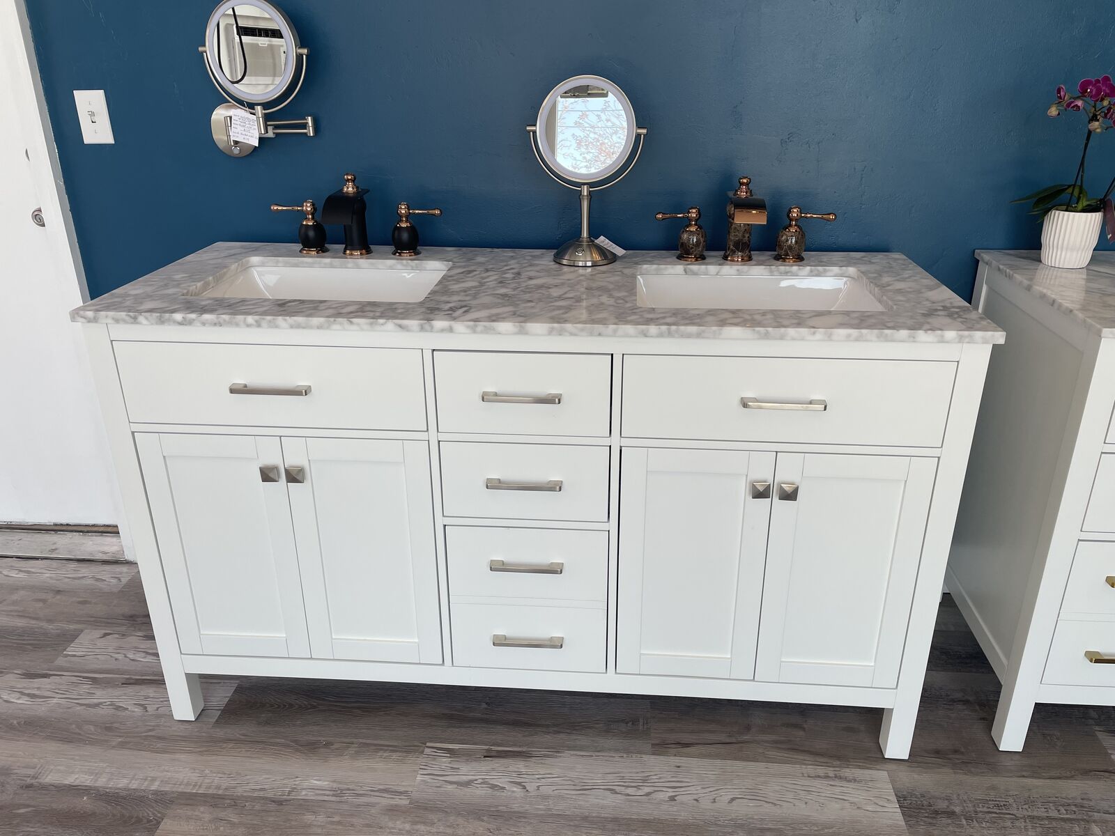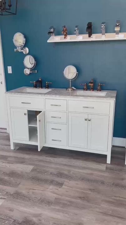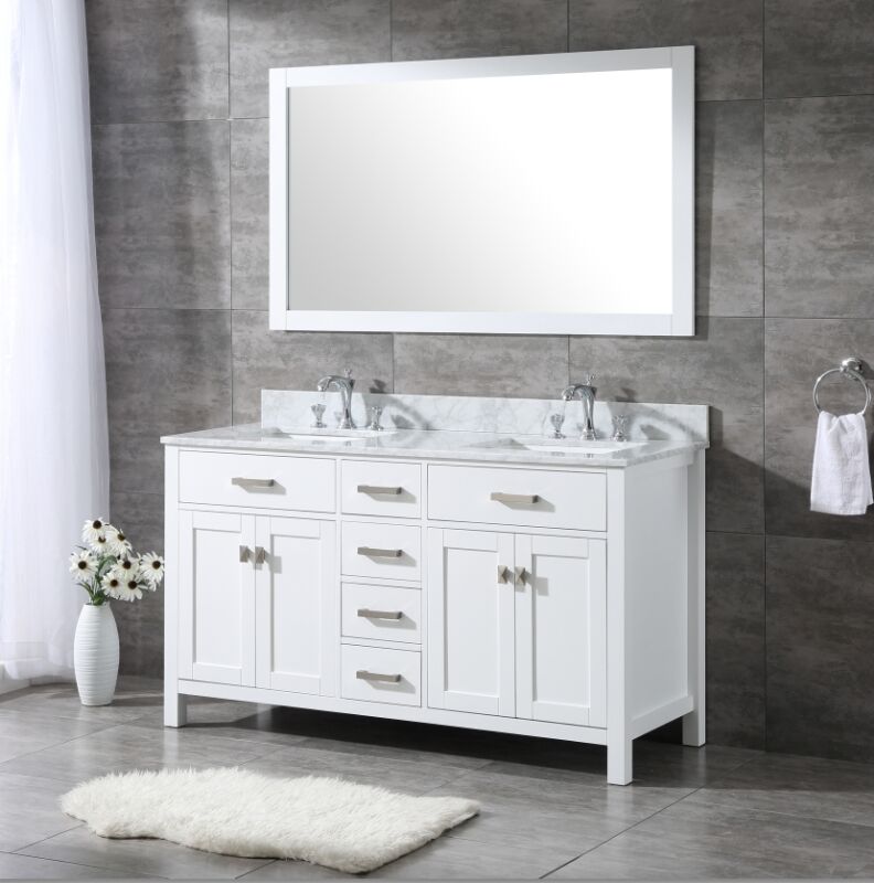60 inch DOUBLE SINK vanity in WHITE: $1195---The vanity top is drilled for 3-hole faucets and the sinks are on the right and left sides of the vanity with soft-close drawers in the middle and the soft-close cabinet doors on the right and left sides. Includes white vanity, natural marble countertop, matching natural marble backsplash, attached sink, vanity handles, and matching mirror. The natural marble counter top and backsplash tend to be a marbled white and grey color. (See pictures) Handles come in Brushed Nickel & Light Gold.
