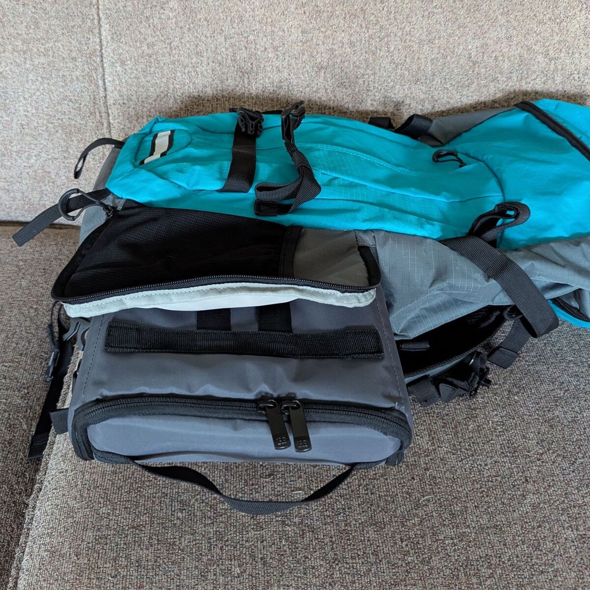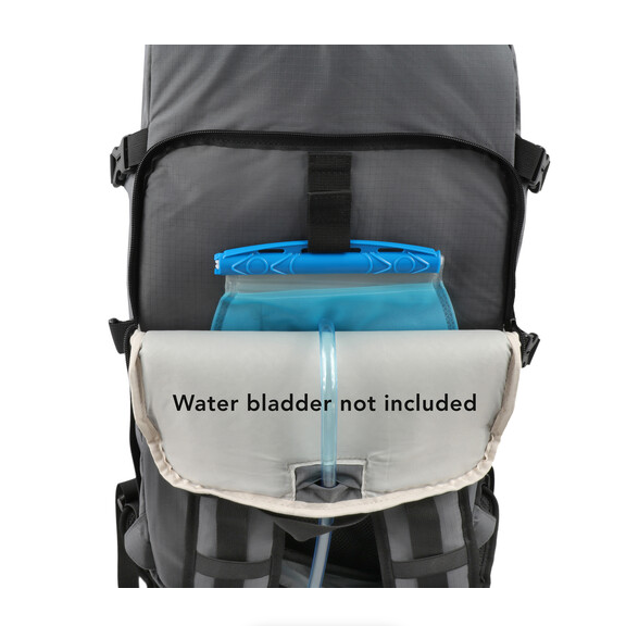 VenmoThis photography backpack has a split main compartment. The hiking gear goes in the top compartment, and an insert goes into the bottom compartment through a zippered side flap. It has a rain cover that can be deployed from a bottom zippered pocket. There are many pockets and straps, including a way to strap a tripod to the outside. The top compartment can hold a fair amount of stuff, and it has a drawstring closure. There is a flap that covers it and buckles into adjustable straps. The flap also contains a small zippered compartment. There is a padded hip belt. Finally, there is a compartment for a hydration bladder, a tablet, or a small computer. This compartment has a strap for hanging the hydration bladder and an opening that the hose can go through.