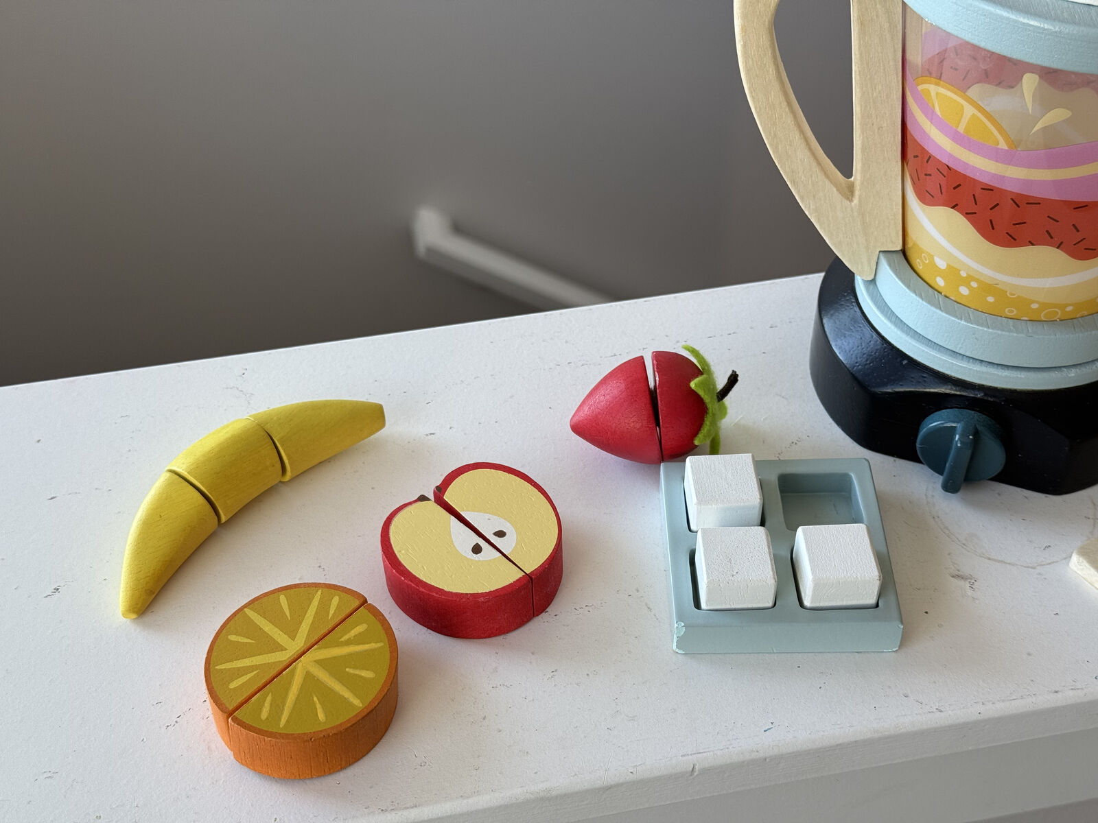 Pretend to be a real smoothie stall with take-away style beaker, striped straw and wooden stirrer. Cut the fruit with the wooden knife and pop it all into the stylish blender with pourer and pretty printed acetate. Blend a strawberry, apple, banana and orange into a delicious smoothie drink, but don't forget the ice cubes!