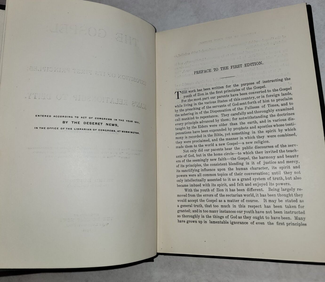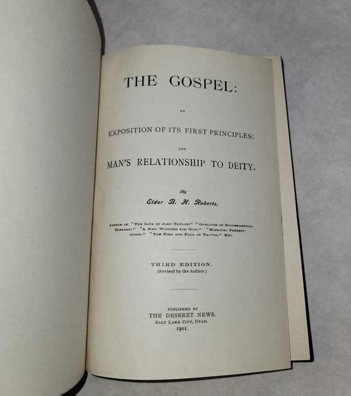 Here is an excellent copy of THE GOSPEL AND MAN'S RELATIONSHIP TO DEITY by B.H. Roberts. This is the edition revised by the author and published by the Deseret News in 1901. Binding is tight, no rips, tears, or writing. The top and bottom of the spine are a little wrinkled. Located in Sandy. Call or text Doug 801-403-0543