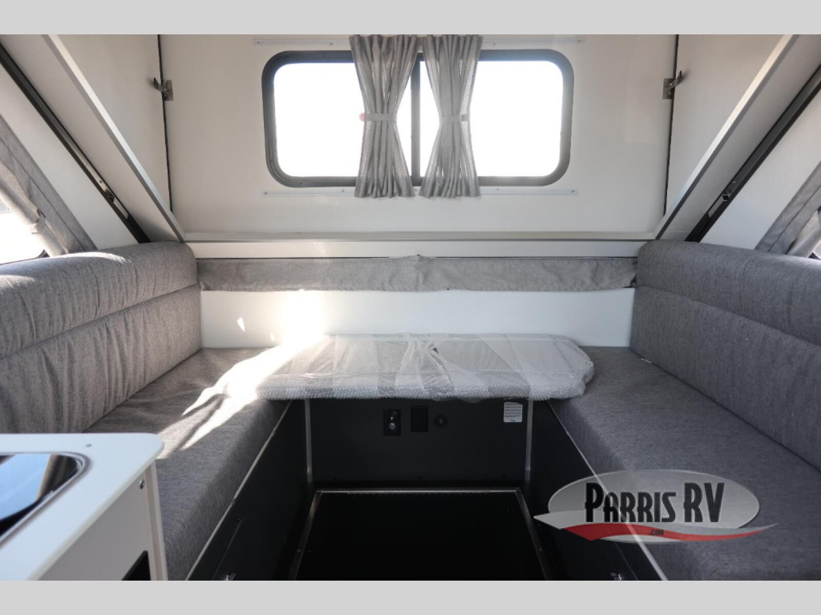 Don't wait another minute; head to the campground in this camper today! There is a two burner cooktop to make lunch on and a 3.0 cu. ft. 3-way refrigerator with a freezer for your cold items, and you can add the optional outside grill if you like to cook outdoors! The sofa bed converts to a queen-size bed and the dinette also converts to a queen-size bed or dual bunks. You'll find storage space under the dinette and on the two shelves, and there is a 32" x 32" hidden shower under the dinette so you can clean up each day. This model also has a dry weight of 2,400 lbs. for easy towing!
