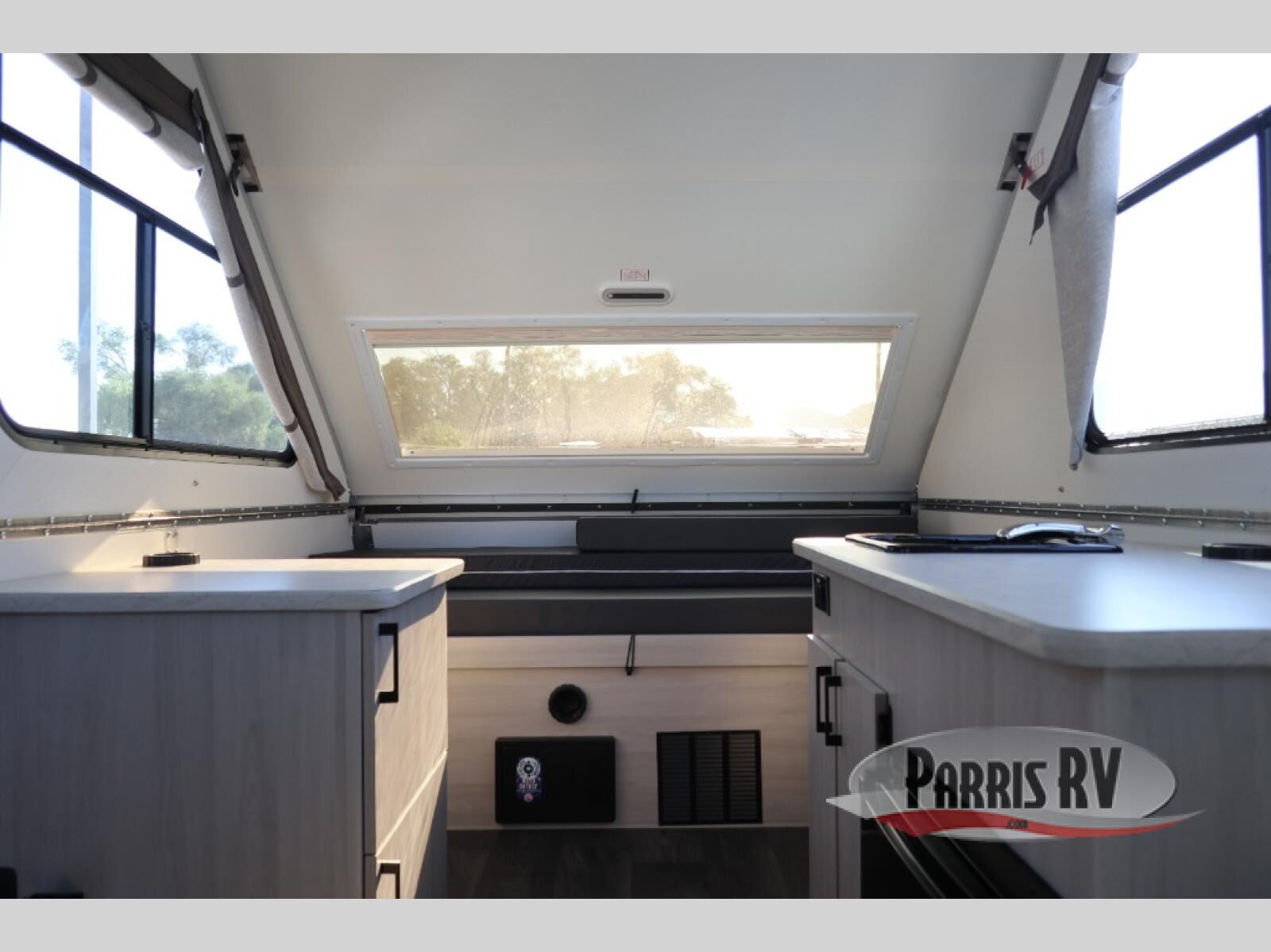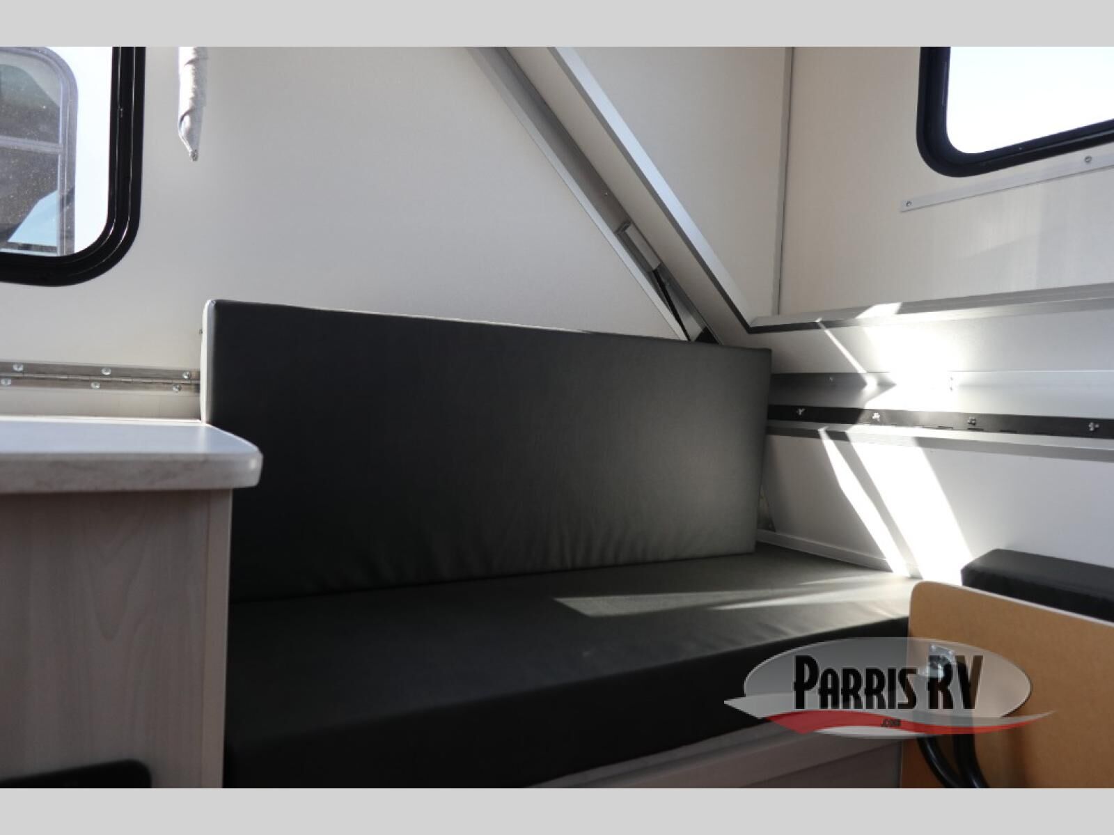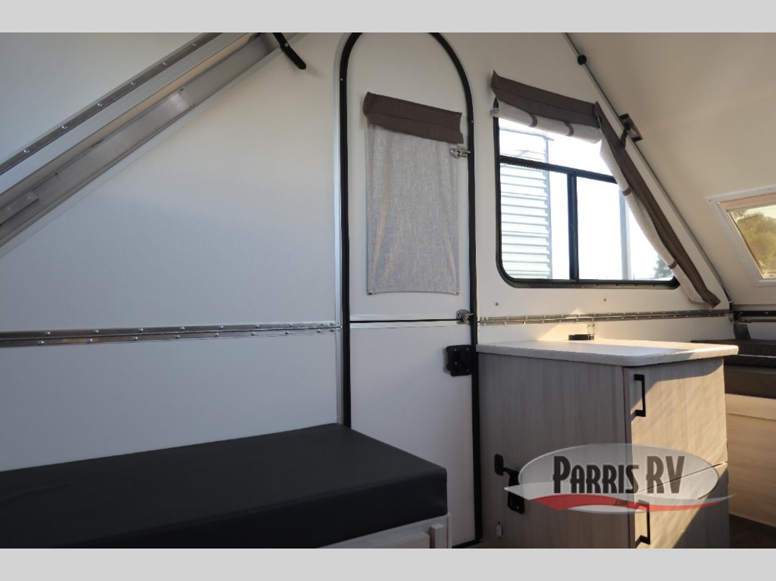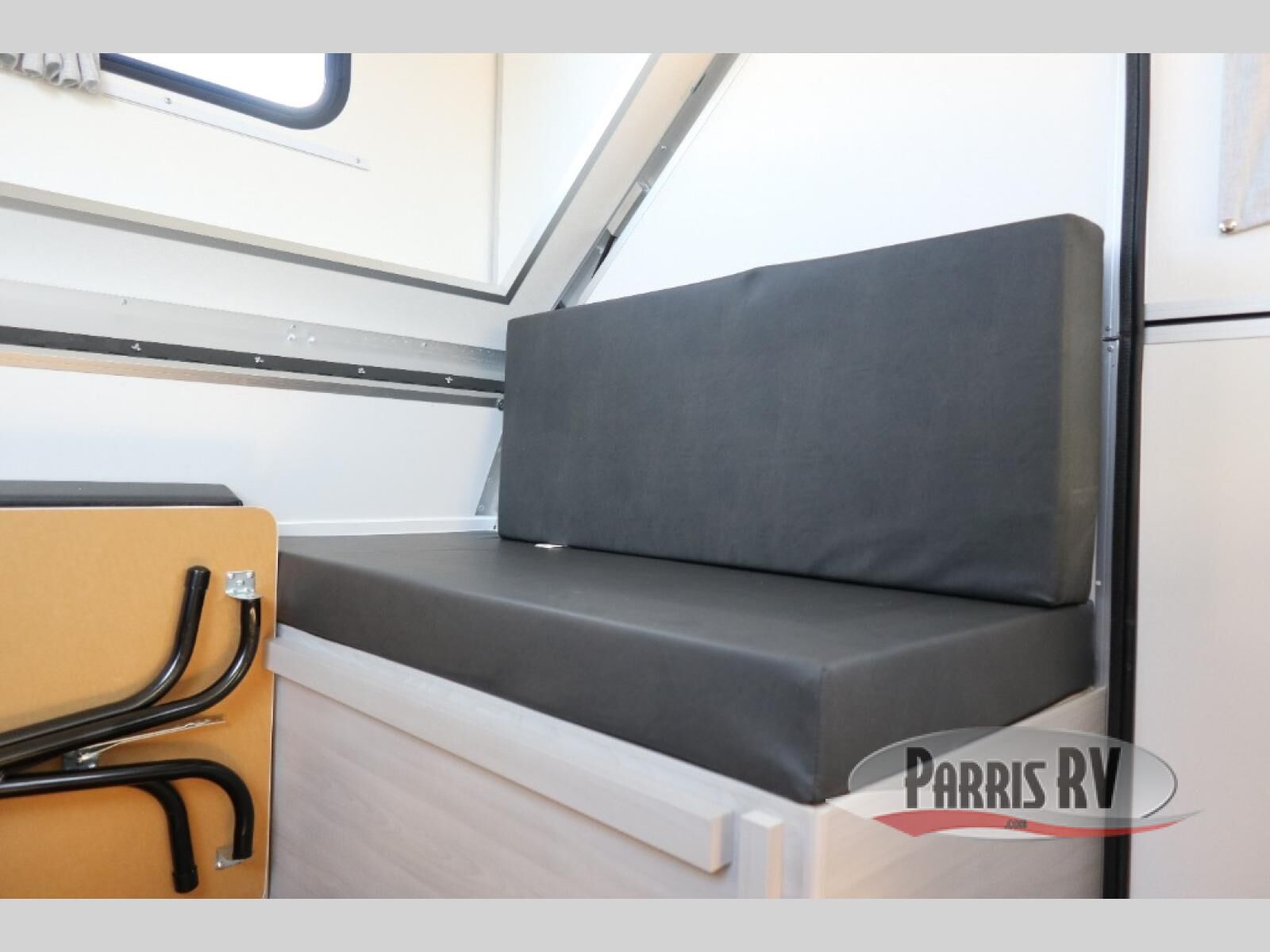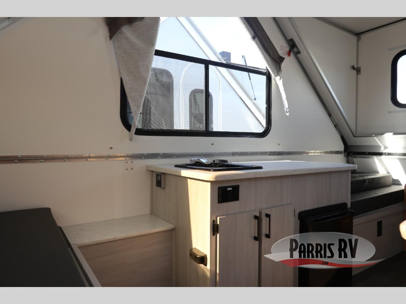Get ready to sleep above ground as you upgrade from tent camping to this A-frame camper! It is easy to tow, set up and store when the fun is over. Inside you will find ample storage for your gear, a dinette to dine at when you aren't outside, a sofa bed to relax on before bedtime, and both furnishings covert to sleeping space. The dinette converts to a 46" x 76" bed, and there is storage under the seats. You will also have shelves to set your phone and such on. There are more features such as three electrical outlets inside, one outlet outside, high density foam, hypoallergenic cushions and mattress, a fantastic vent-fan, and options to choose from such as a front soft dormer, a rear soft dormer, and/or an Extreme Off-Road package, plus more!