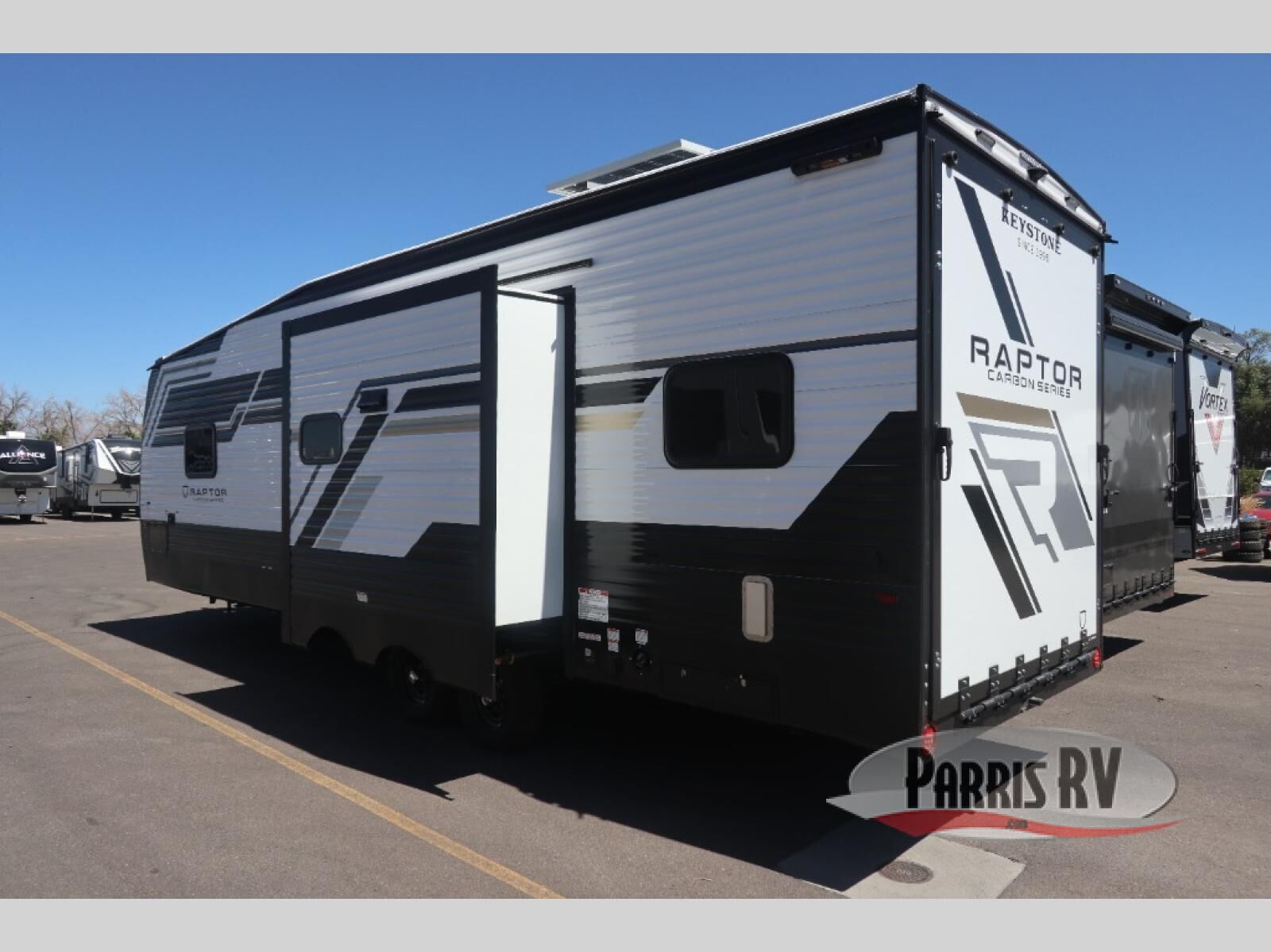 Keystone Raptor Carbon Series toy hauler aluminum travel trailer 30WFO highlights: