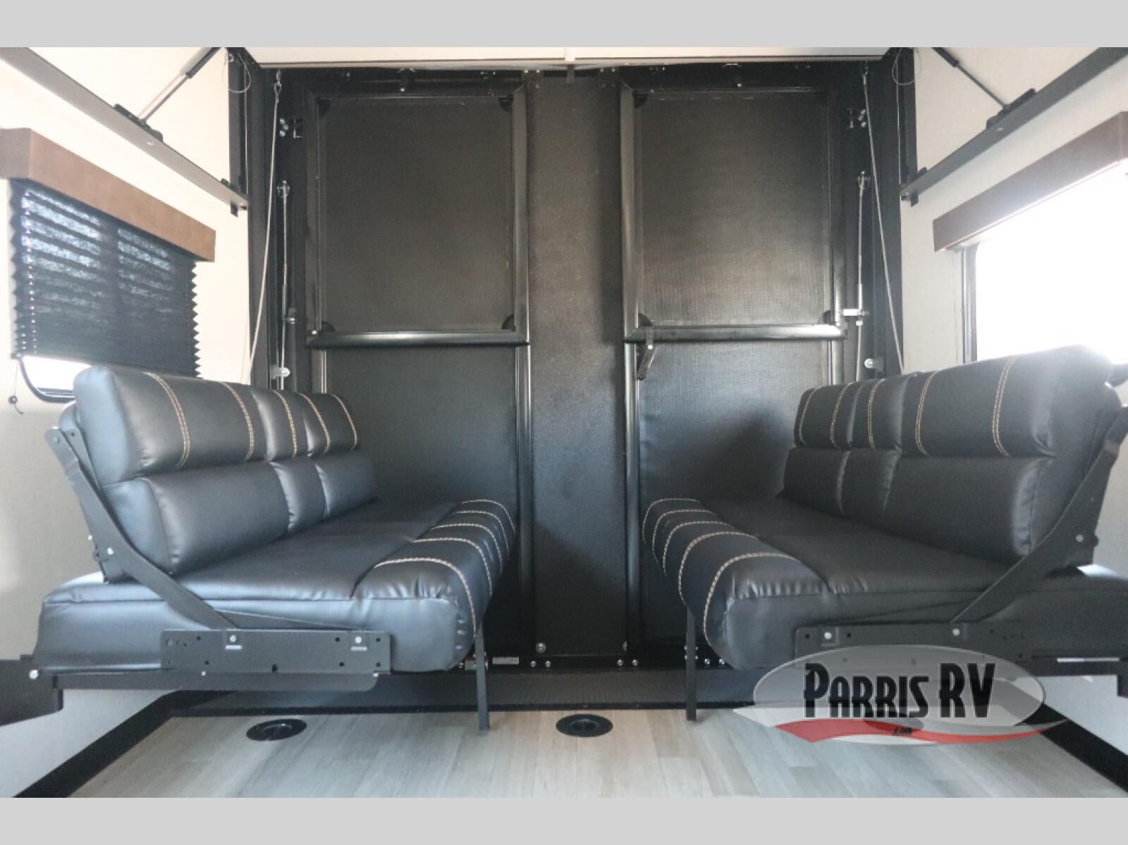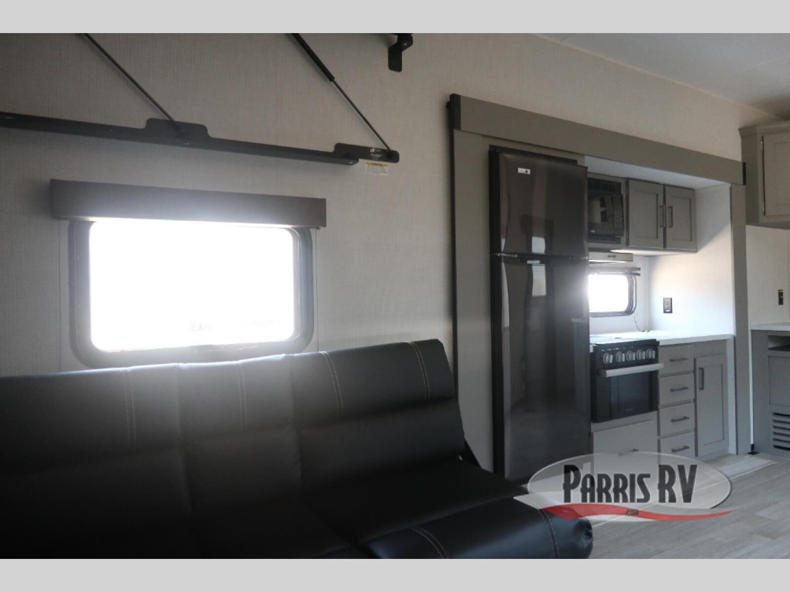 Enjoy a weekend of fun with family and friends with this wide open concept toy hauler featuring 15' of garage space for your toys! This unit sleeps six with the RV queen bed in front and the dual roll over sofas and bonus bunk in back. The 15' garage with 5K inter-lock system tie downs will get all of your cargo safely to your destination. Once in camp, the rear ramp door will help you easily unload and then set up the sofas with table in between. The kitchen slide featuring a hutch allows you to refuel your bodies easily by providing a three burner range and 17" black oven, a 10.7 cu. ft. 12V refrigerator for your perishables, and a residential microwave oven to warm up leftovers. The full bath will allow everyone to easily clean up after a full day of fun, and you will enjoy the private front bedroom with an RV queen bed and a full closet for all of your things. On the outside, an 18' power awning provides added living space, or you might like to add the optional patio packaged for a raised extension of your unit giving you an outdoor space to hang out and enjoy some fresh air between rides.