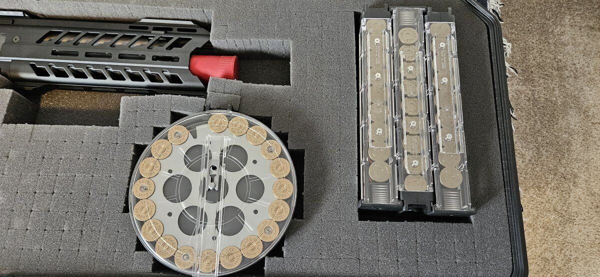PayPalTokyo Marui brand Fires 3 BB at the same time per trigger pull in both semi and full auto. Heavy duty metal upper receiver and handguard with polymer lower receiver and furniture M-LOK rail system PCU muzzle flash unit Fore-grip with flashlight unit and laser pointer 3x Mid-cap mags and 1x 3000 round drum mag Includes hard case