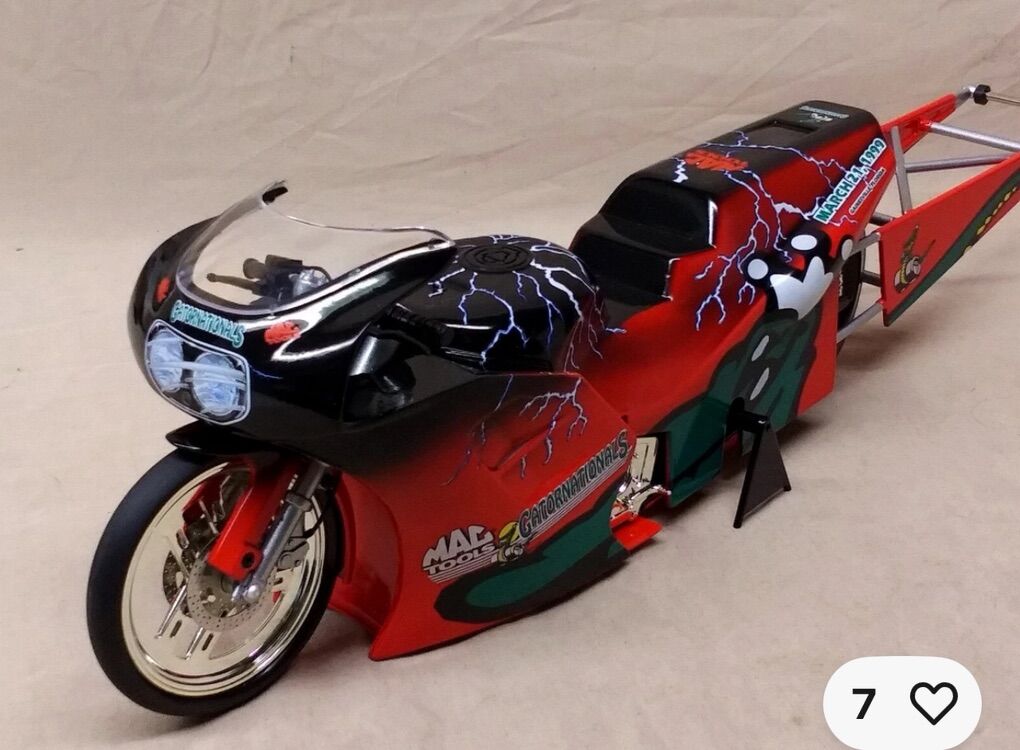 ZelleThis limited edition 1999 Gatornationals Pro Stock Bike is a must-have for any adult collector of diecast motorcycles. The bike is a perfect scale model (1:9) of the famous NHRA drag bike, complete with the iconic red, green, and black colors. This advertising specimen is a rare find for fans of the Gatornationals and MAC TOOLS theme.