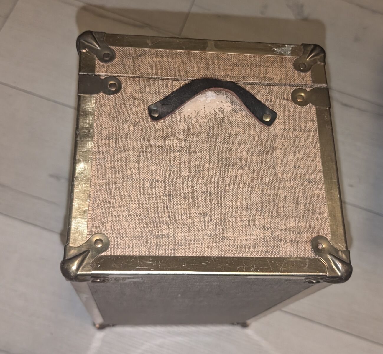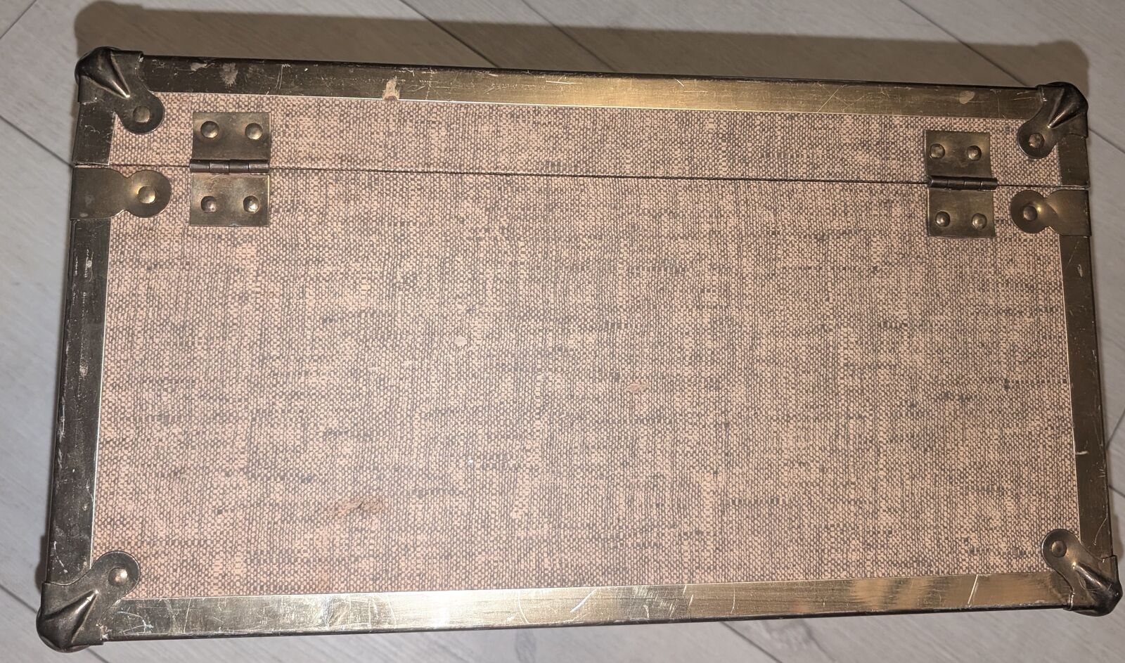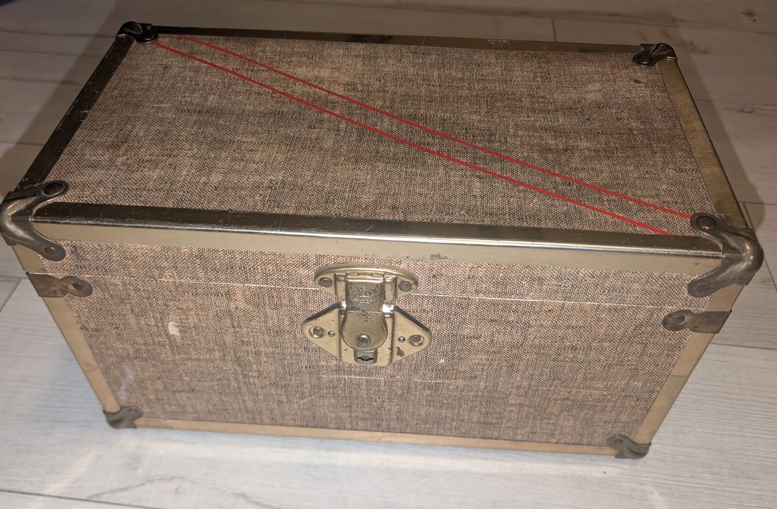 SEE ALL PICTURES. I took a pictures of every angle. Measres 7"x8"x14". Vintage/antique item. Does not need a key, push button and it unlocks to open. Has tray inside that you can take in and out and put things underneath. Has minor wear but overall condition is good. Clean.