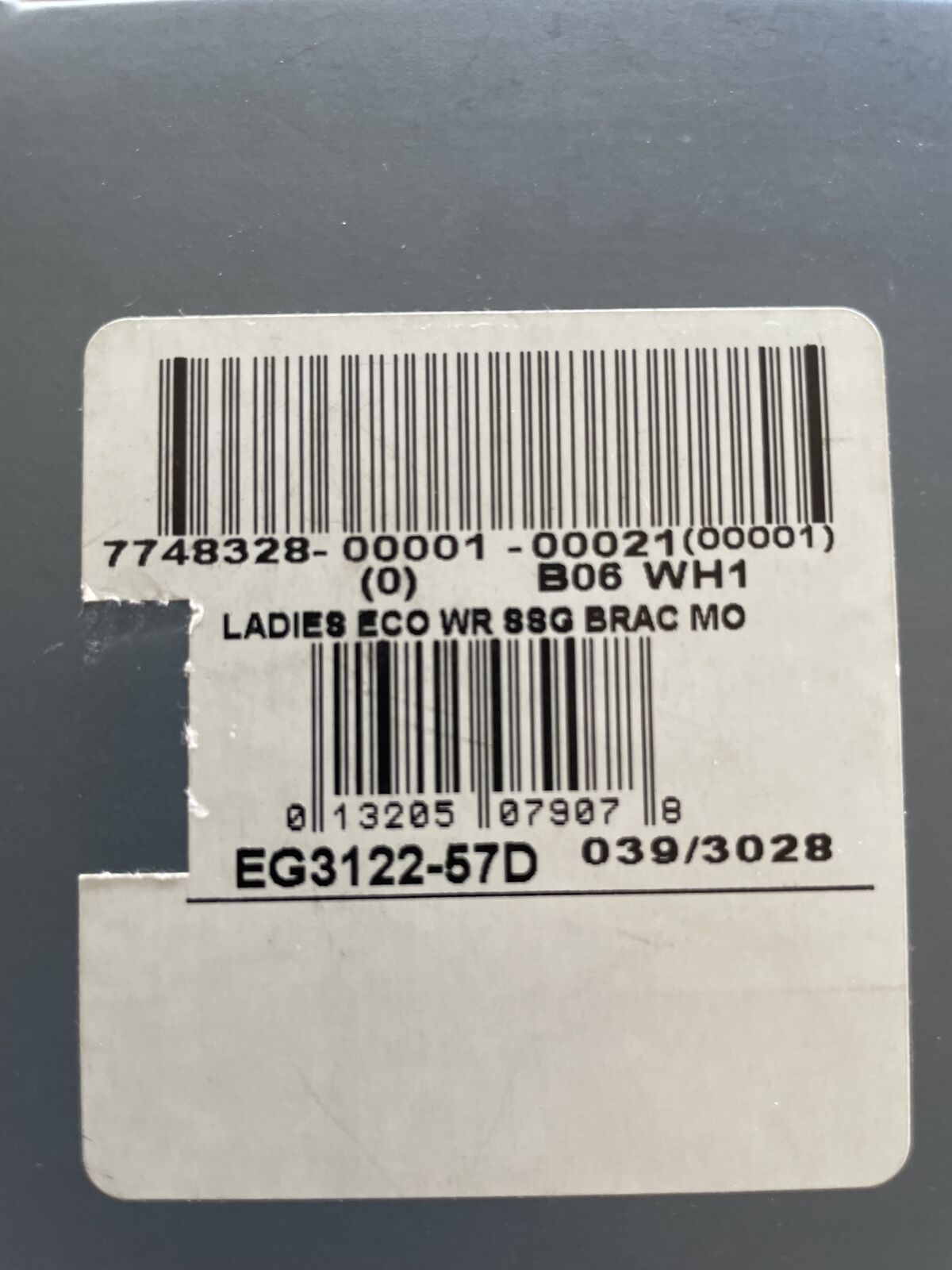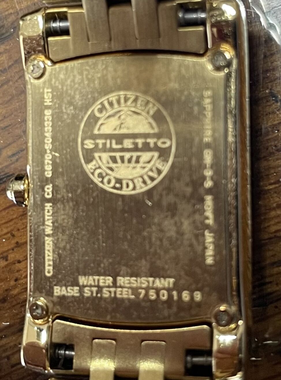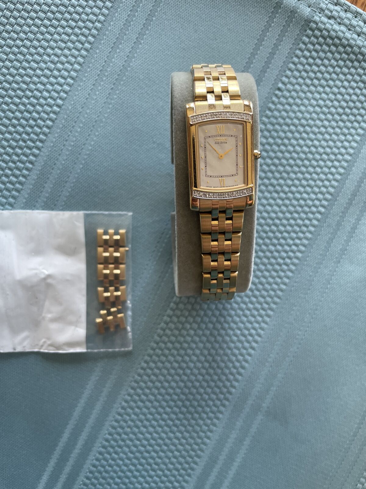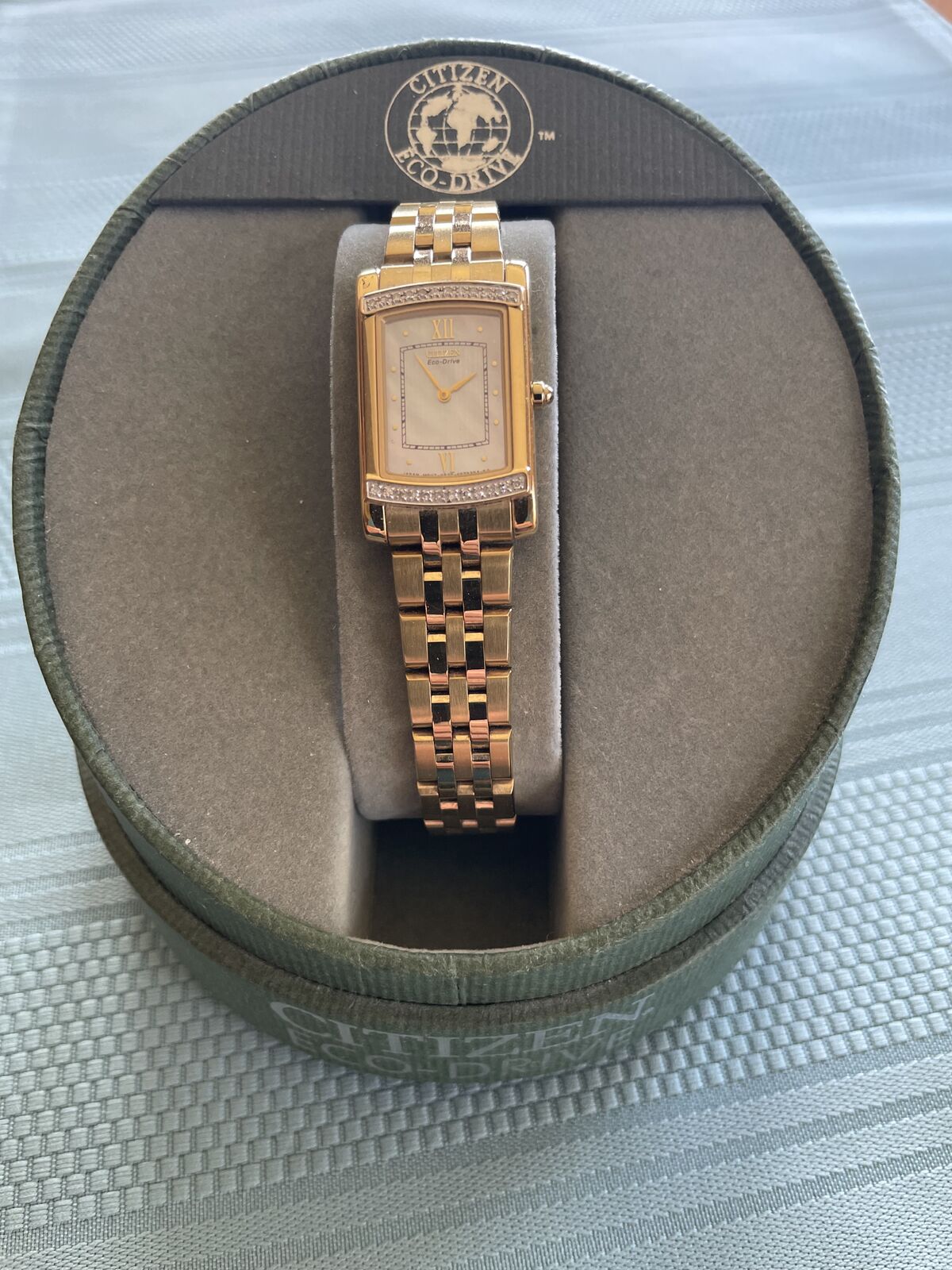 Perfect Holiday Special Gift!! Ladies' Citizen Eco-Drive Stiletto Gold-Tone Watch with Diamond Bezel (Model: EG3122-57D. This particular watch is difficult to find with the diamonds framing the face on the top and bottom. The watch is solar powered and uses a secondary battery to store the power needed when not in the light. That secondary battery was replaced about 4 years ago. It keeps excellent time. The original box and manuals are included along with links to expand the band if needed.
