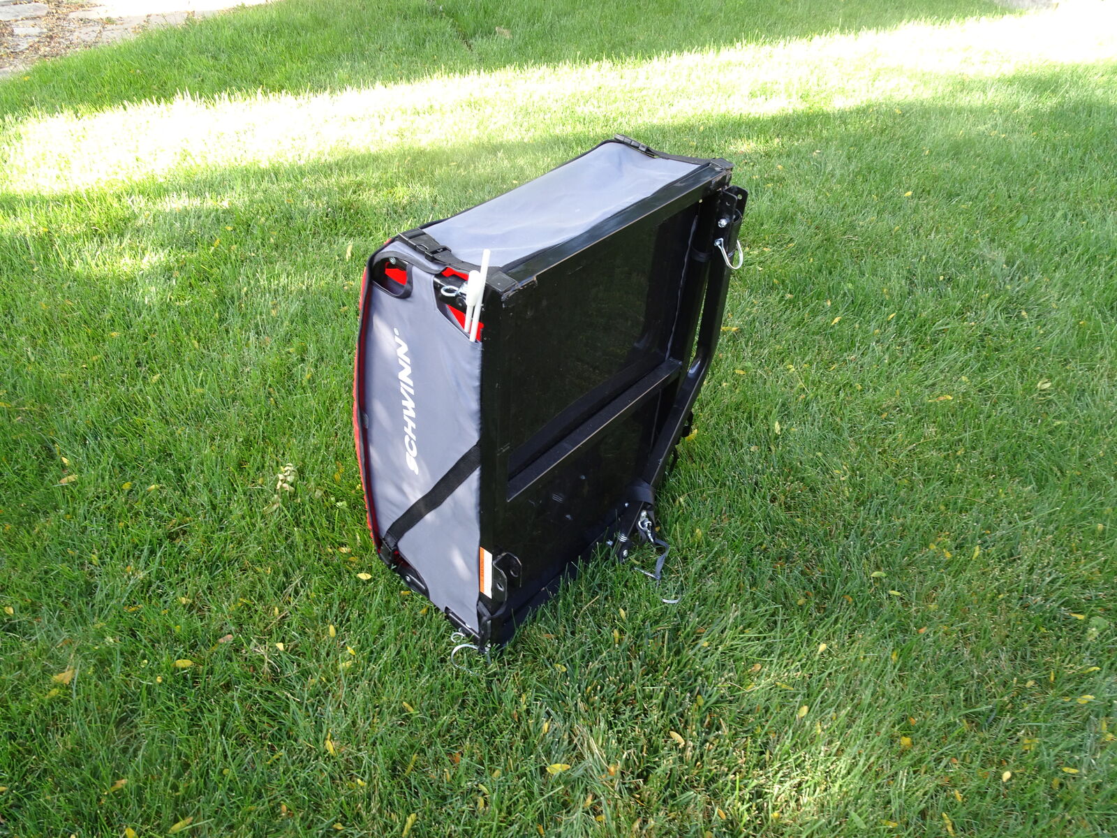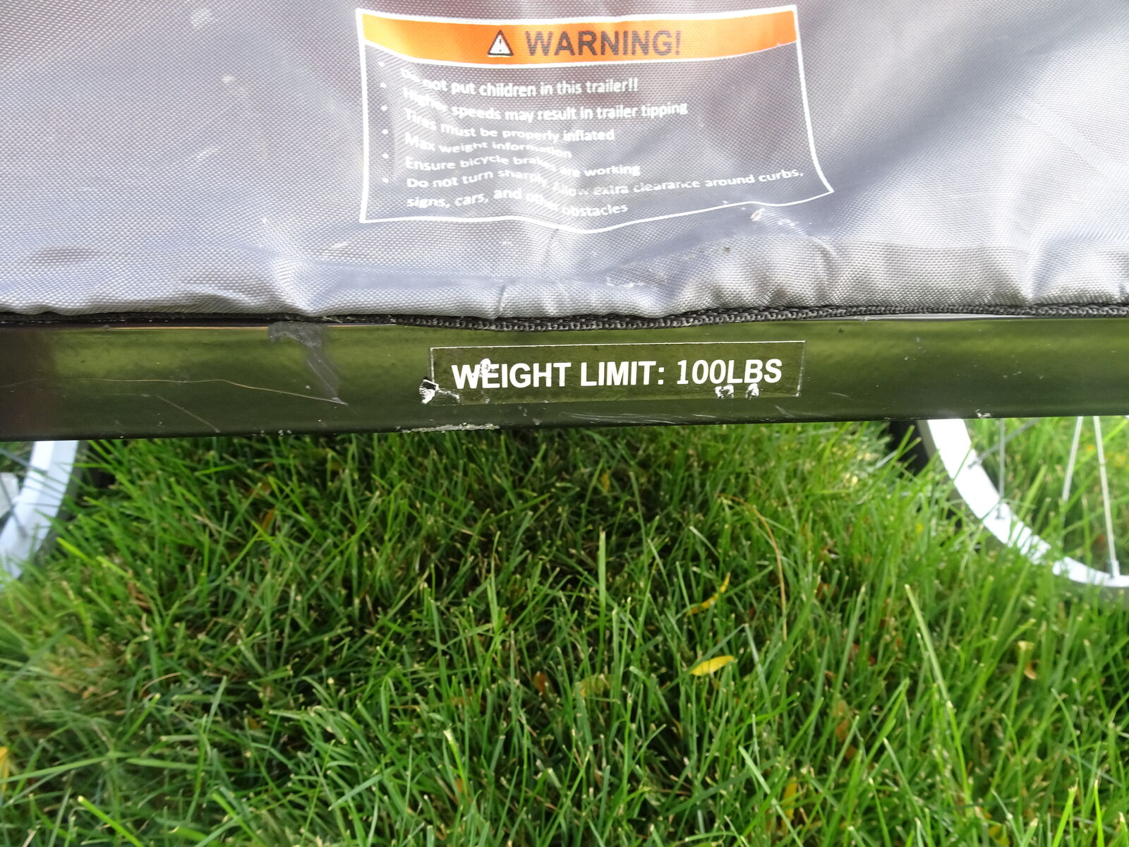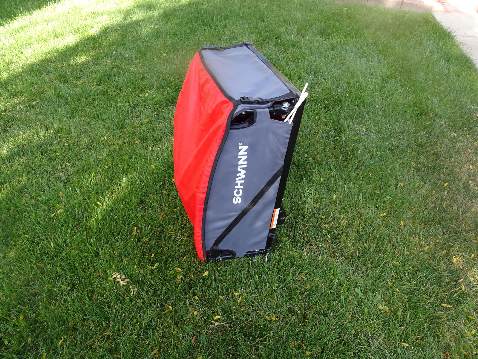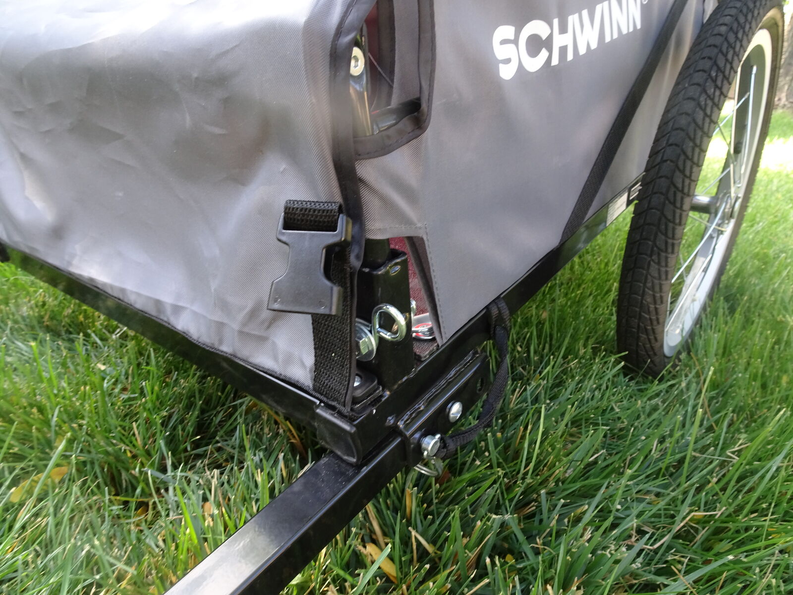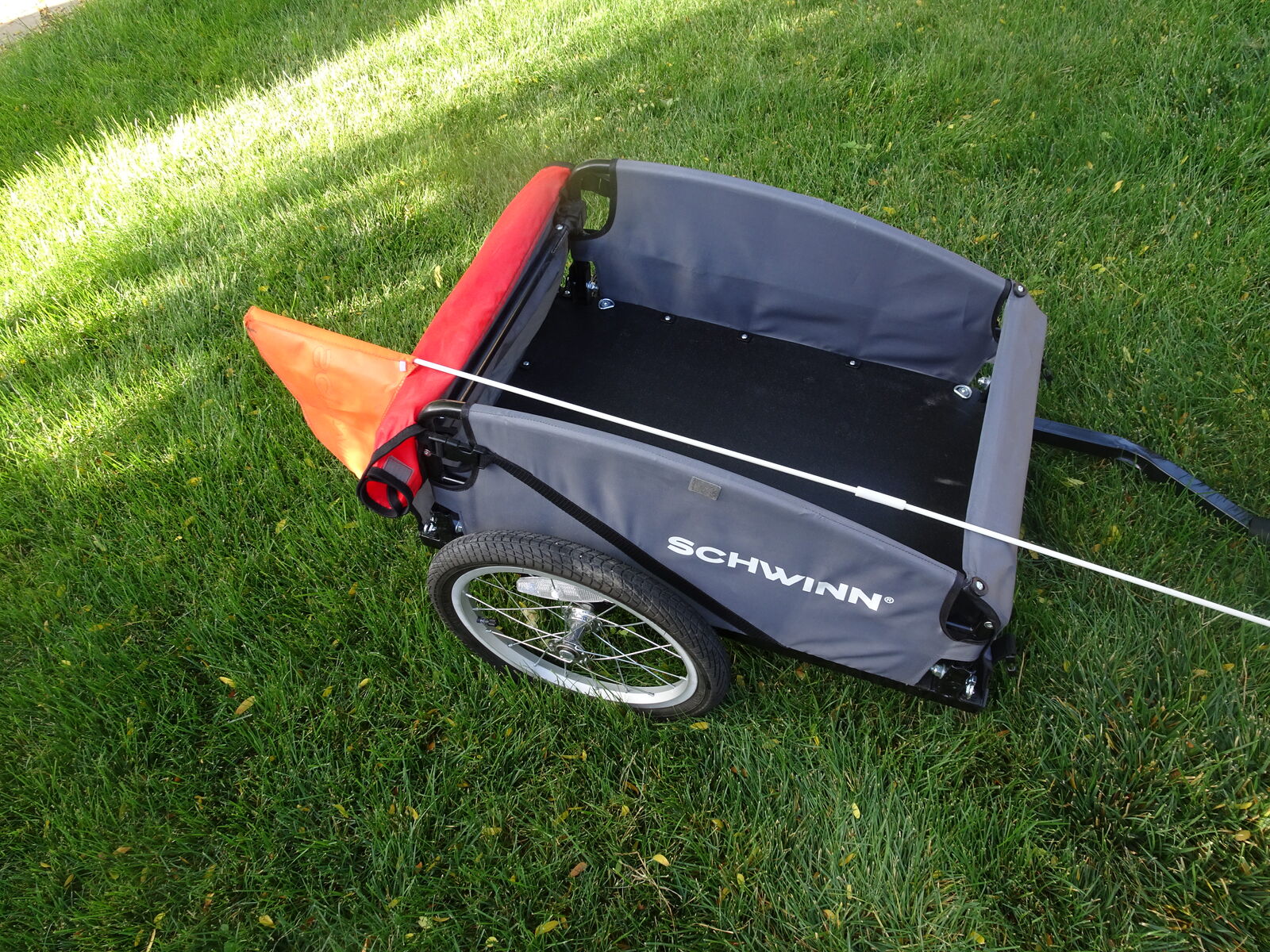 Schwinn Daytripper Cargo Trailer. Towing capacity rated for a maximum of 100 lbs, universal coupler, folding frame for convenient sub-compact storage and transport, quick-release wheels, 16-inch air filled tires for a smooth ride, and interior d-rings. I also added outside rings for additional tie downs.