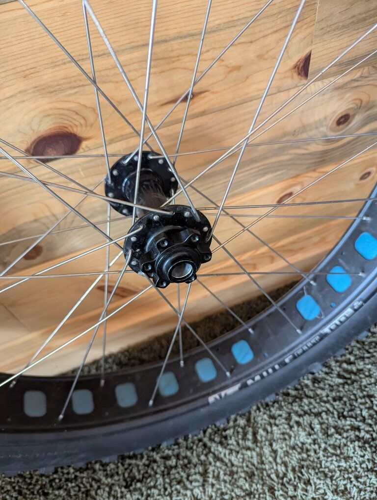 ZelleFat bike, snow bike front wheel from Pivot Les Fat bike. Rim: Sun Ringle Mule Fut 80 SL, 26in diameter, 80mm width Hub: Salsa, 6 bolt disc Front hub 15 x 150mm. Tire: Maxxis Mammoth 26x4.0, 120tpi, EXO protection, Tubeless Ready. Wheel and tire are in good condition. I removed the wheel from my wife's snowbike for an upgrade. Thanks for checking them out.