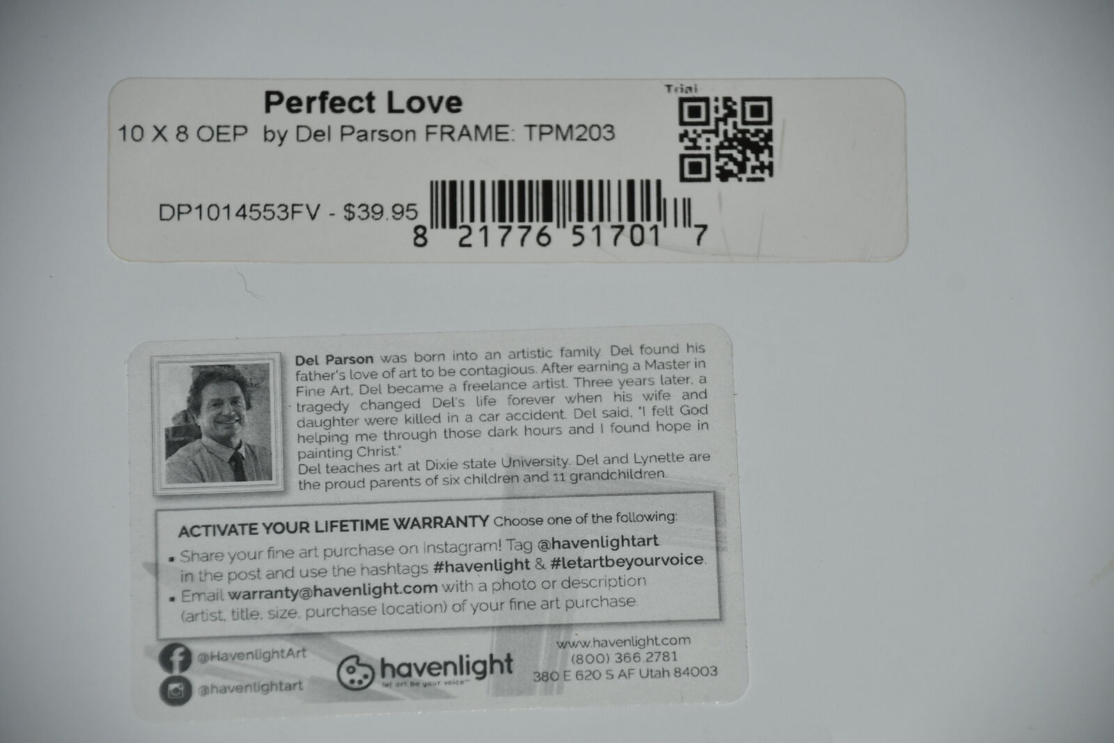 This "PERFECT LOVE" PICTURE by DEL PARSON is about 11" x 13" FRAMED. It is TEXTURED. Our home is smoke free. Questions??? Please ask. We are located in Plain City. Cash only please.