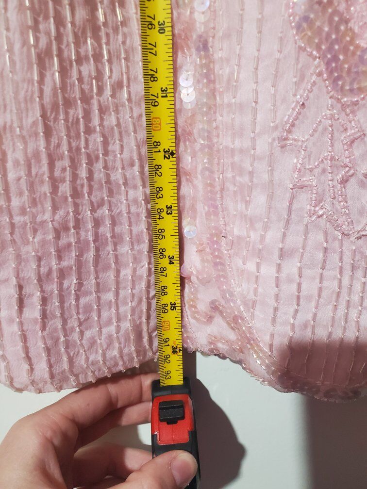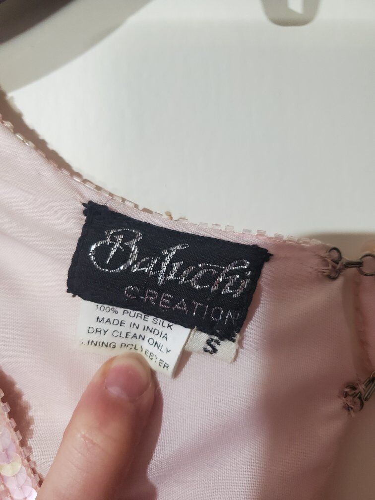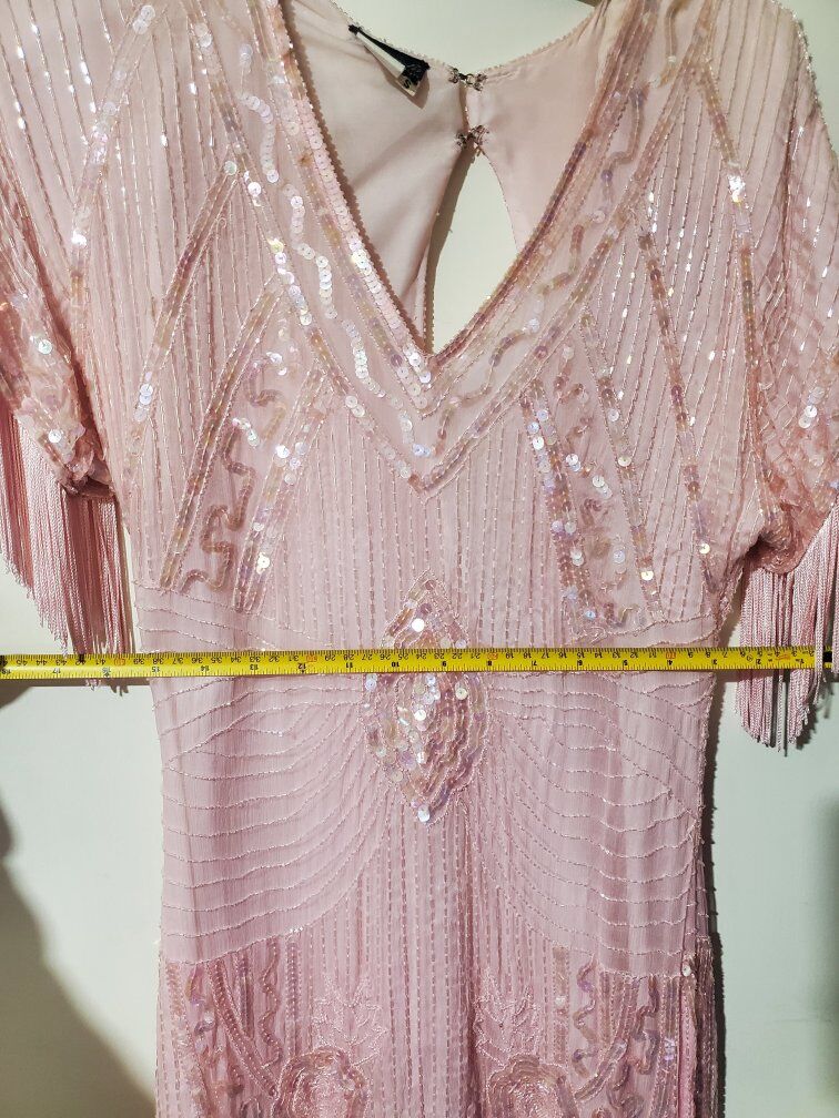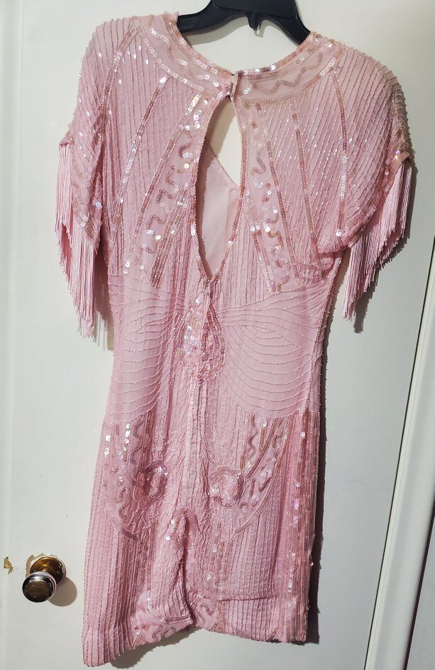 Pale pink flapper dress with beading, sequins, and fringe. Short sleeves, V neck, padded shoulders.