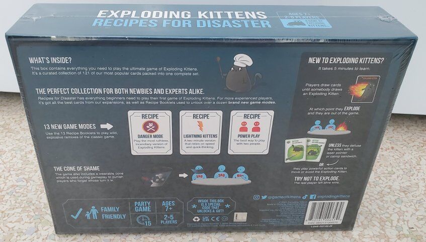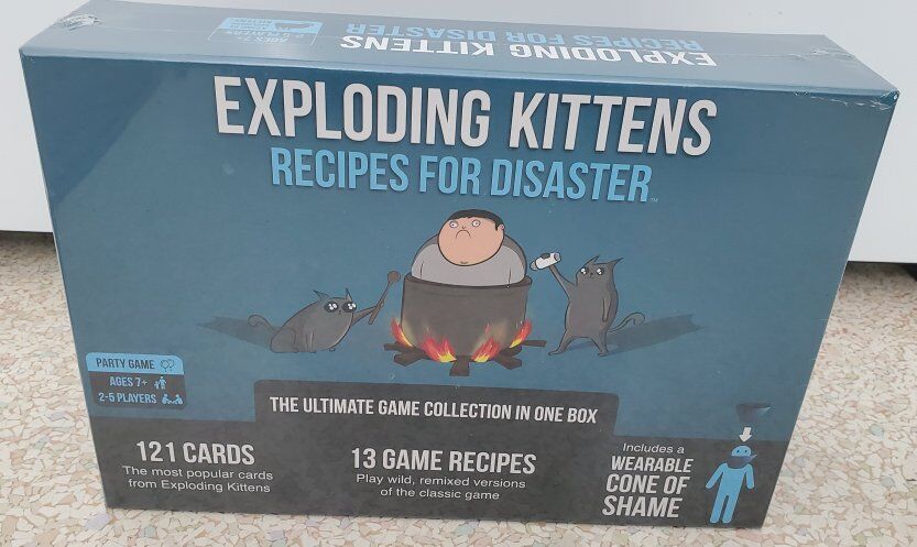 Exploding kittens recipes for disaster the ultimate game collection in one box includes wearable cone of shame Brand new never opened party game