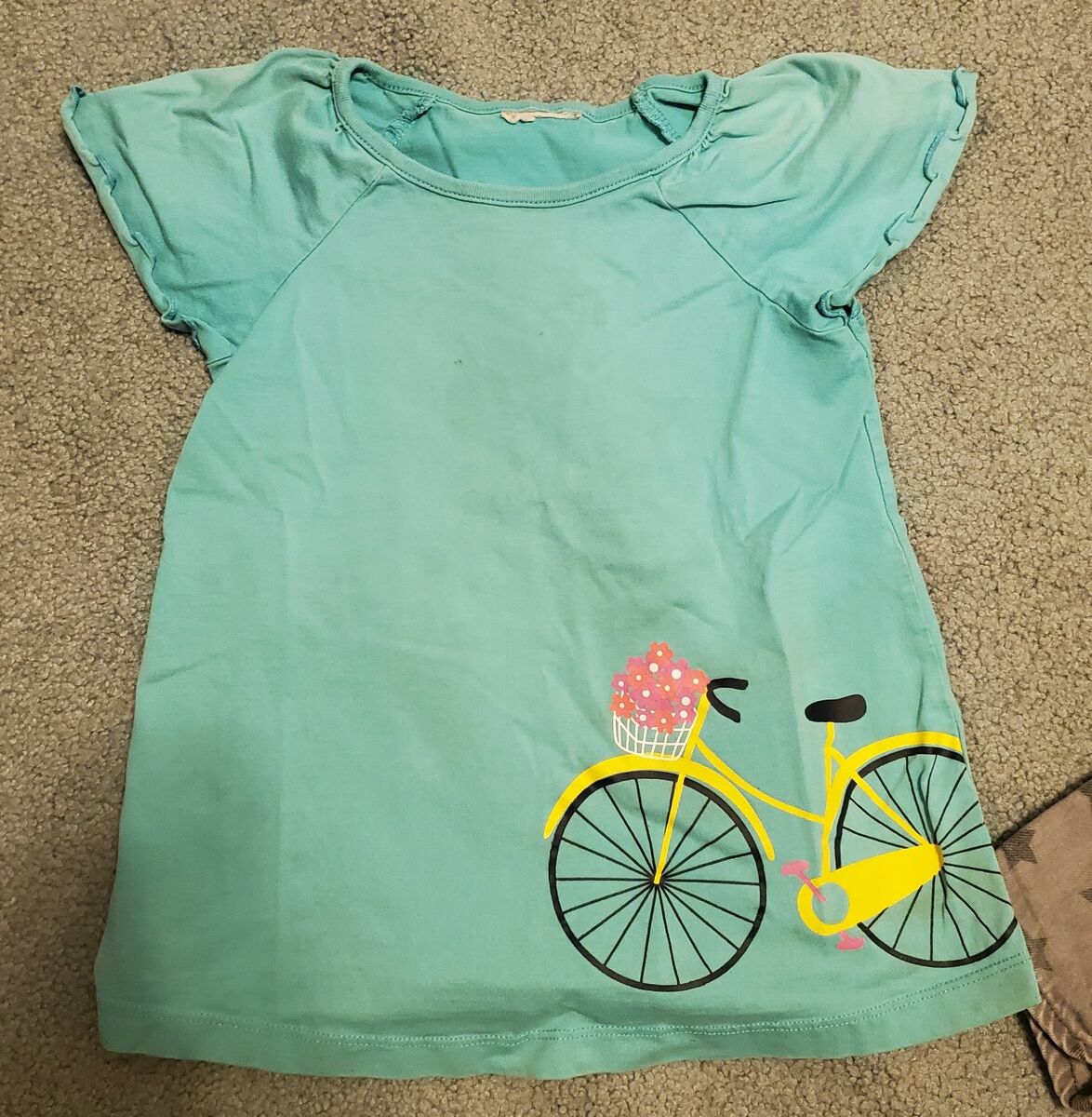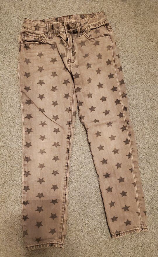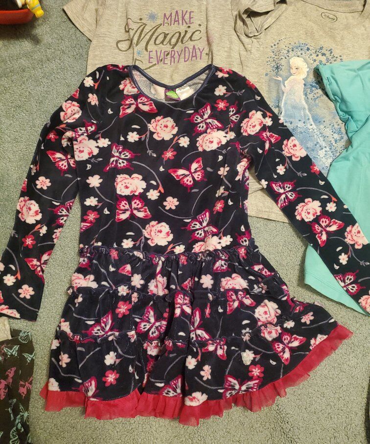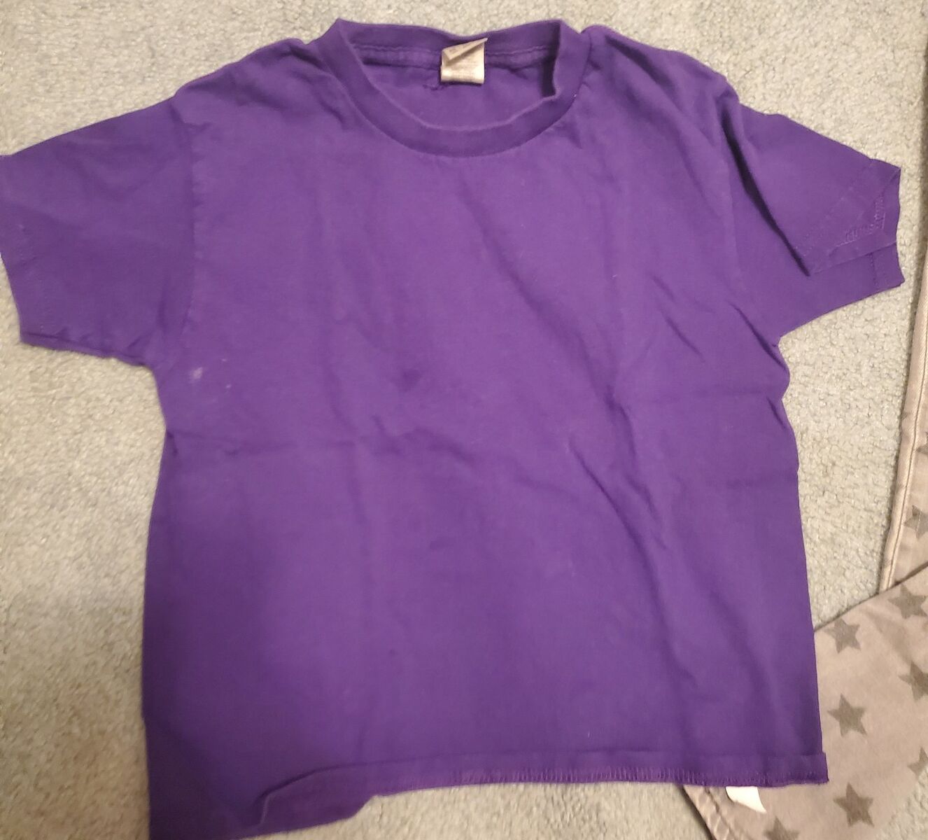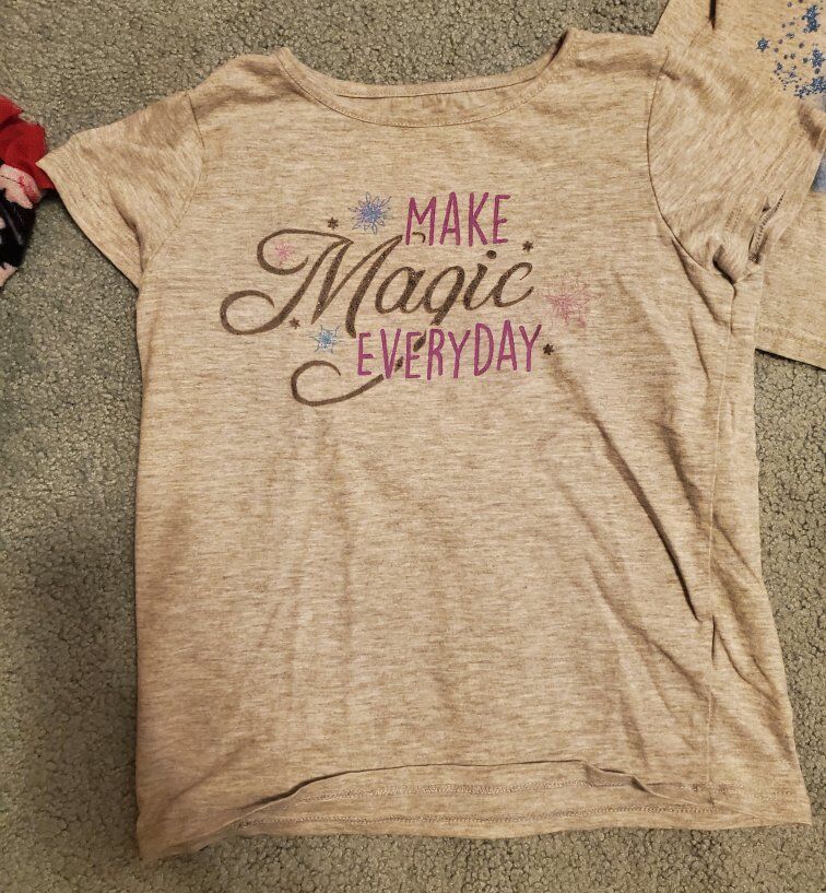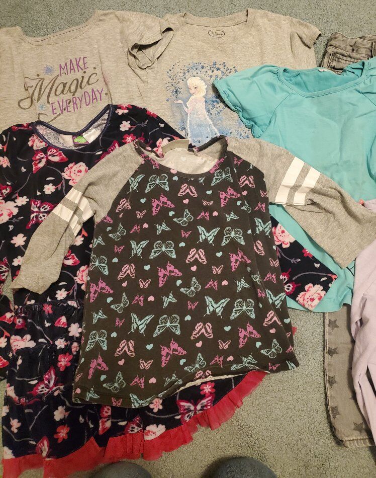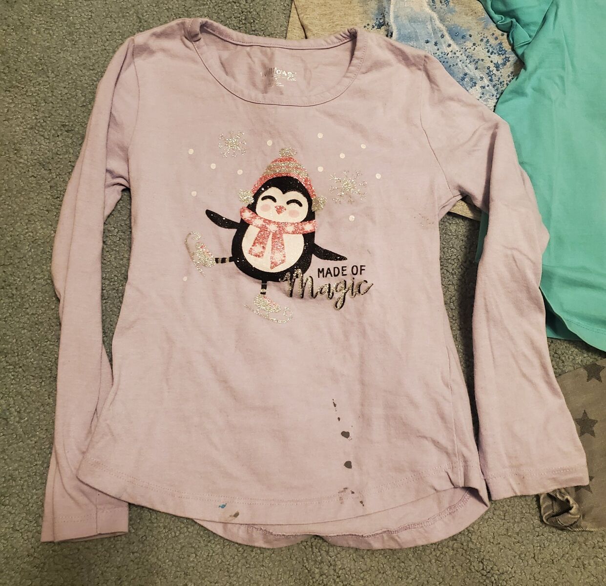 7 shirts and one pair of pants The pants are a 7 regular girlfriend from gapkids 7 shirts: the purple one is brand Gildan size extra small youth The blue 1 with the bicycle had its tag cut off The purple 1 with the Penguin and sparkles says made of magic brand wallflower girl size small 6/7 2 gray shirts both brand Disney size medium 7/8 1 of them has elsa on it the other one says made of magic Black shirt with blue and purple butterflies and hearts brand Bobbie Brooks for girls size medium 7/8 the last shirt dark blue pink flowers and butterflies is soft brand Dollie and me A few of the shirts have paint stains and or other small stain or 2 Good condition see pictures
