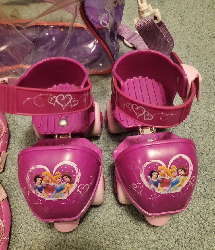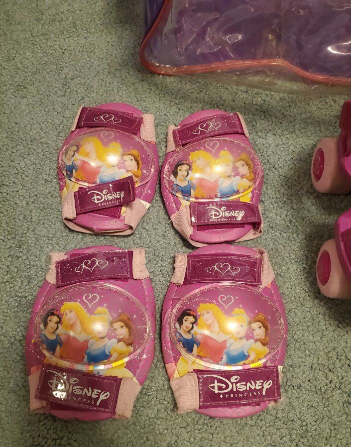 Disney Princess adjustable roller skates Grow with me skates Great for young children learning to roller skate Pink and purple snow white Cinderella Aurora sleeping beauty bell Beauty and the beast Comes with skates, knee pads, elbow pads, and case to carry them Good condition See pictures for details $ obo
