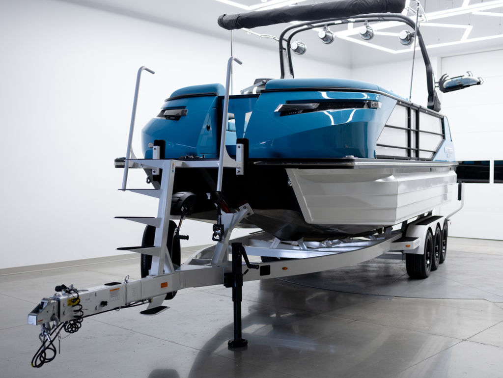Fully optioned Surf boss with all the things you want on your new Surf Boat. ZZ6 PCM 6.2L engine, Premium Audio, and a sun lounger that makes this surf boat like nothing else on thee water. With 4,200lbs of ballast and a fully adjustable triple tab surf system you will be sure to dial in the wave just how you like. Our unique boat design offers the best attributes of a tow boat combined with the best attributes of a high end pontoon boat. Get the room, ride, storage, and ease of entry of a pontoon boat along with the handling and wakes of a tow boat. Truly two boats in one. This Surf Boss has the new SL floor plan. The Stern Lounge layout is designed with an open center walkway, ensuring easy access across the deck. At the rear, a generously sized lounge seat offers a relaxing space to enjoy the surroundings, perfect for gathering with friends or soaking up the sun.
