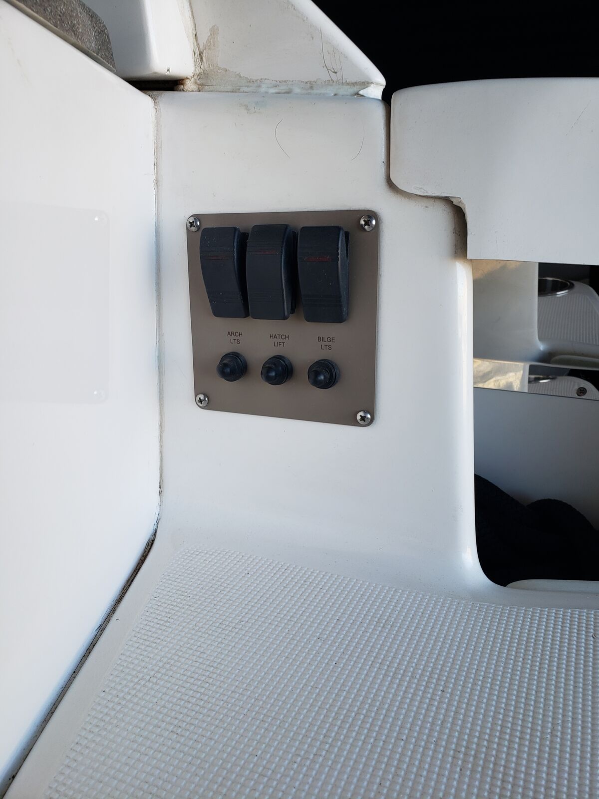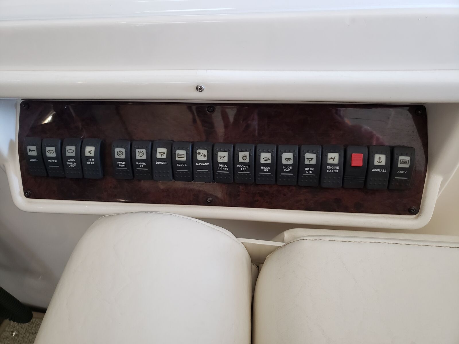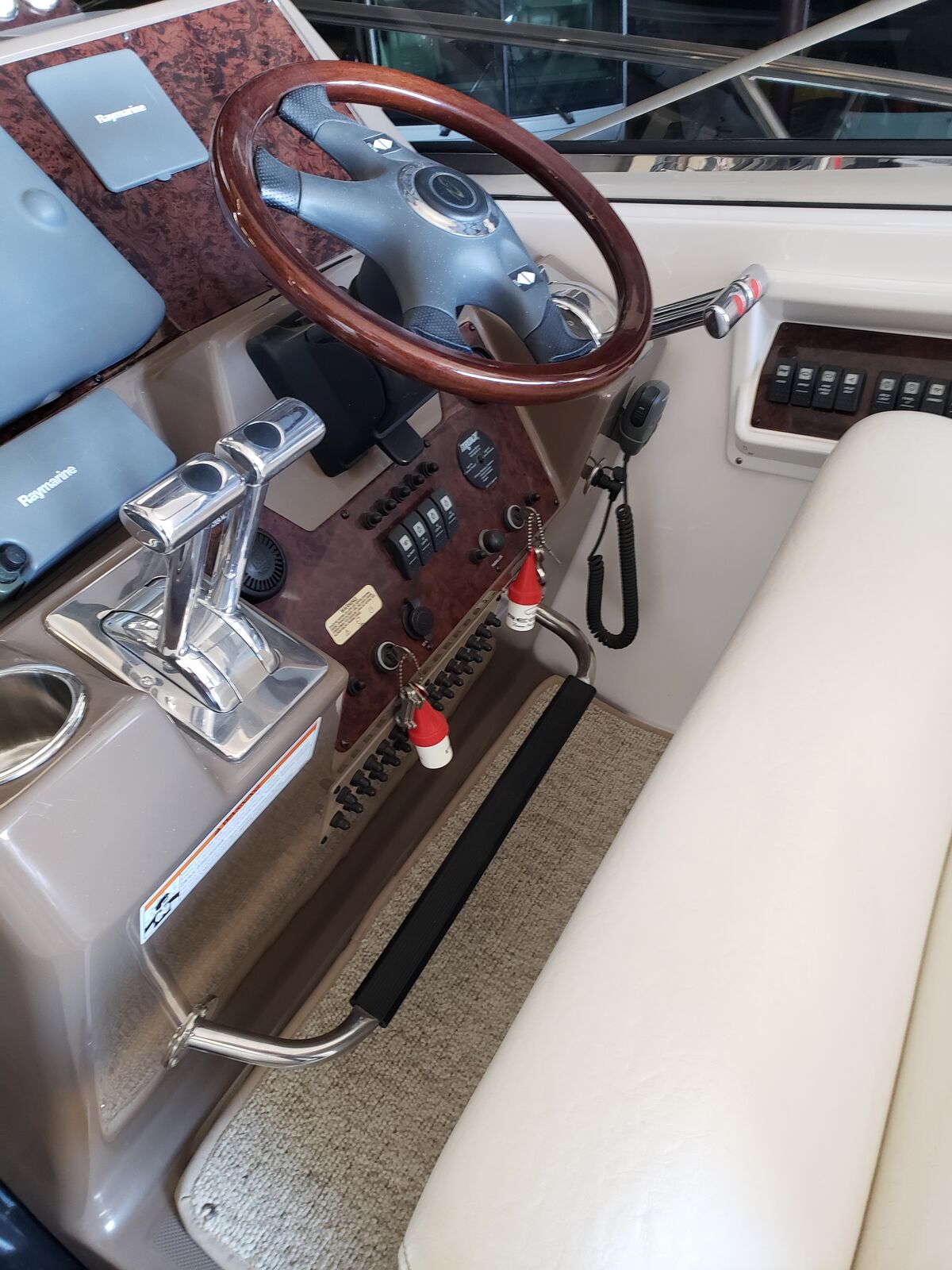 DUAL SPLIT CHROME THROTTLE & SHIFT CONTROLS. VETUS JOYSTICK BOW THRUSTER. TRIM TABS. RAYMARINE C-SERIES GPS CHARTPLOTTER/RADAR/FISHFINDER. VHF RADIO. ELECTRIC HATCH LIFT.