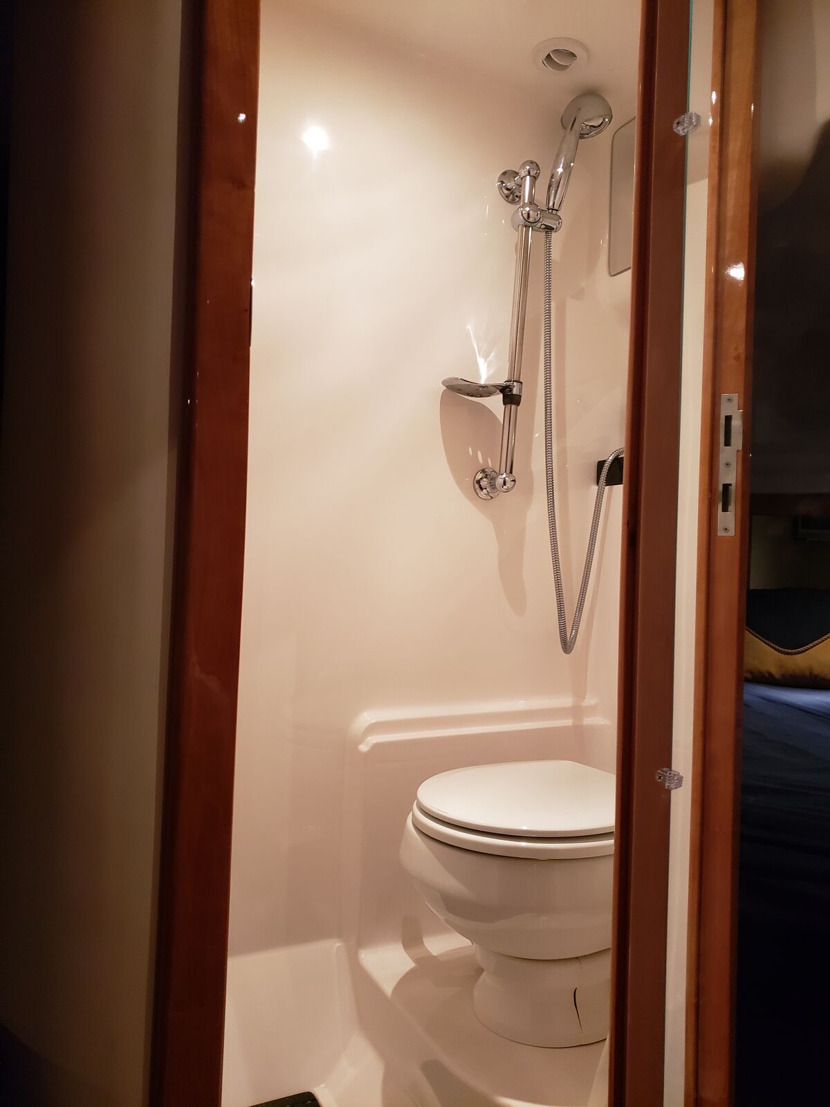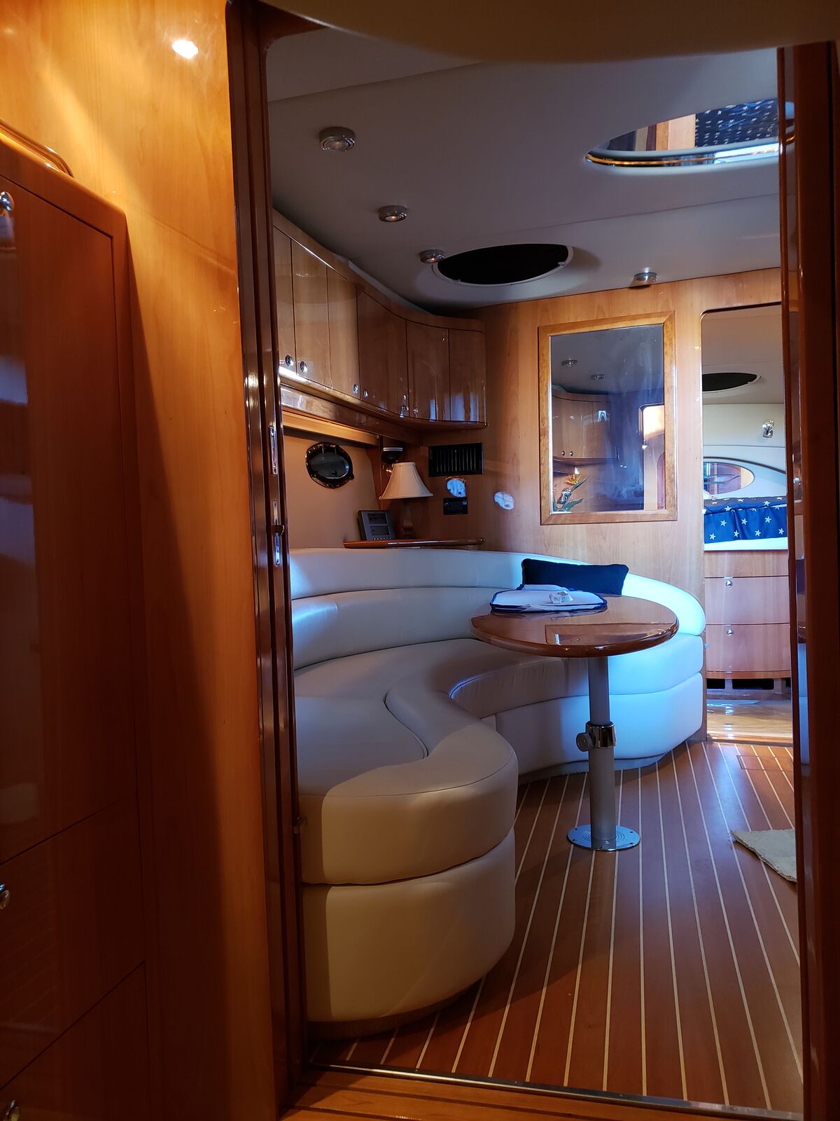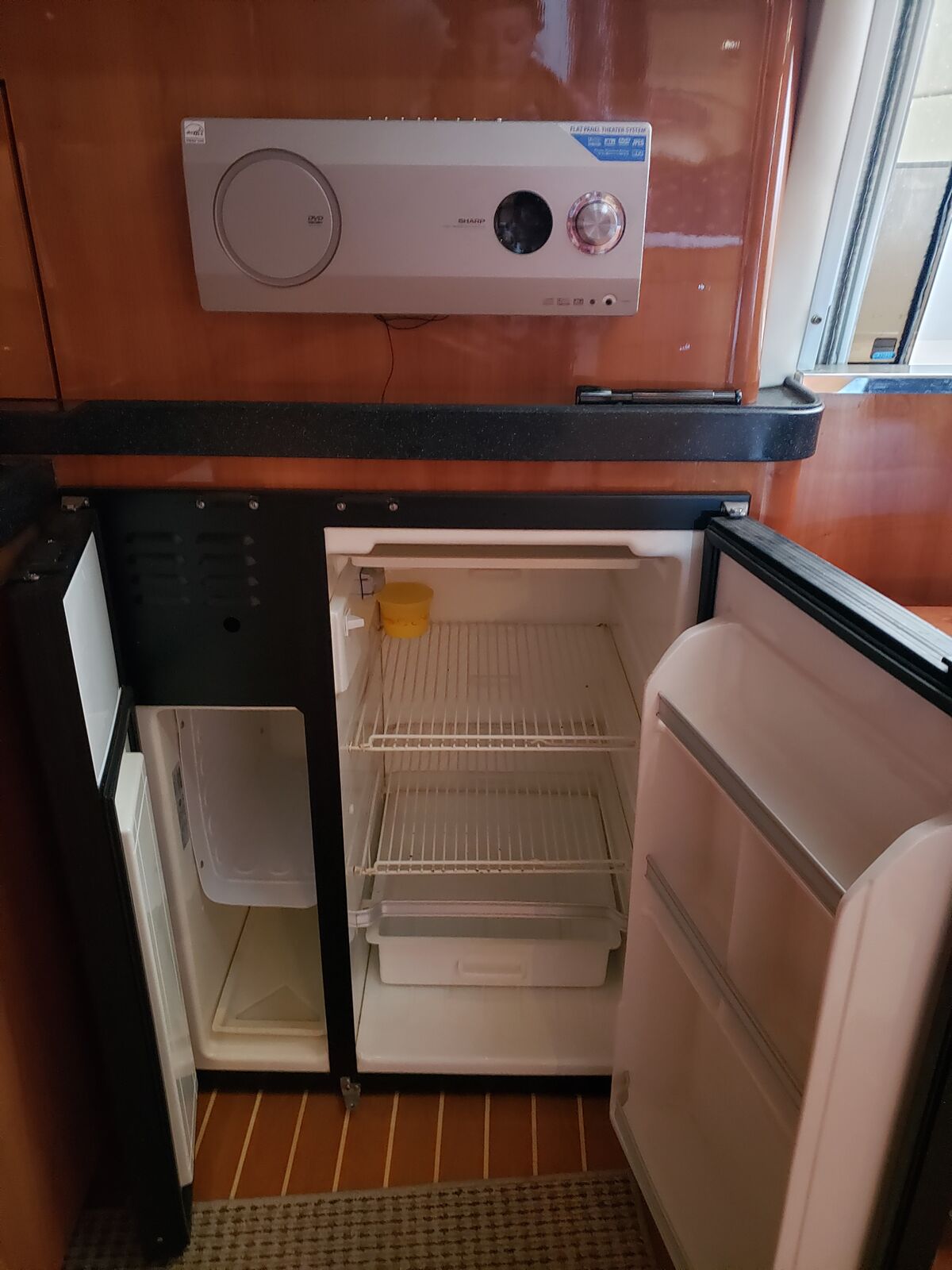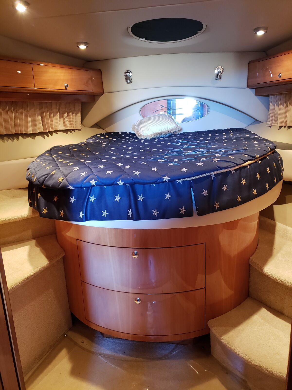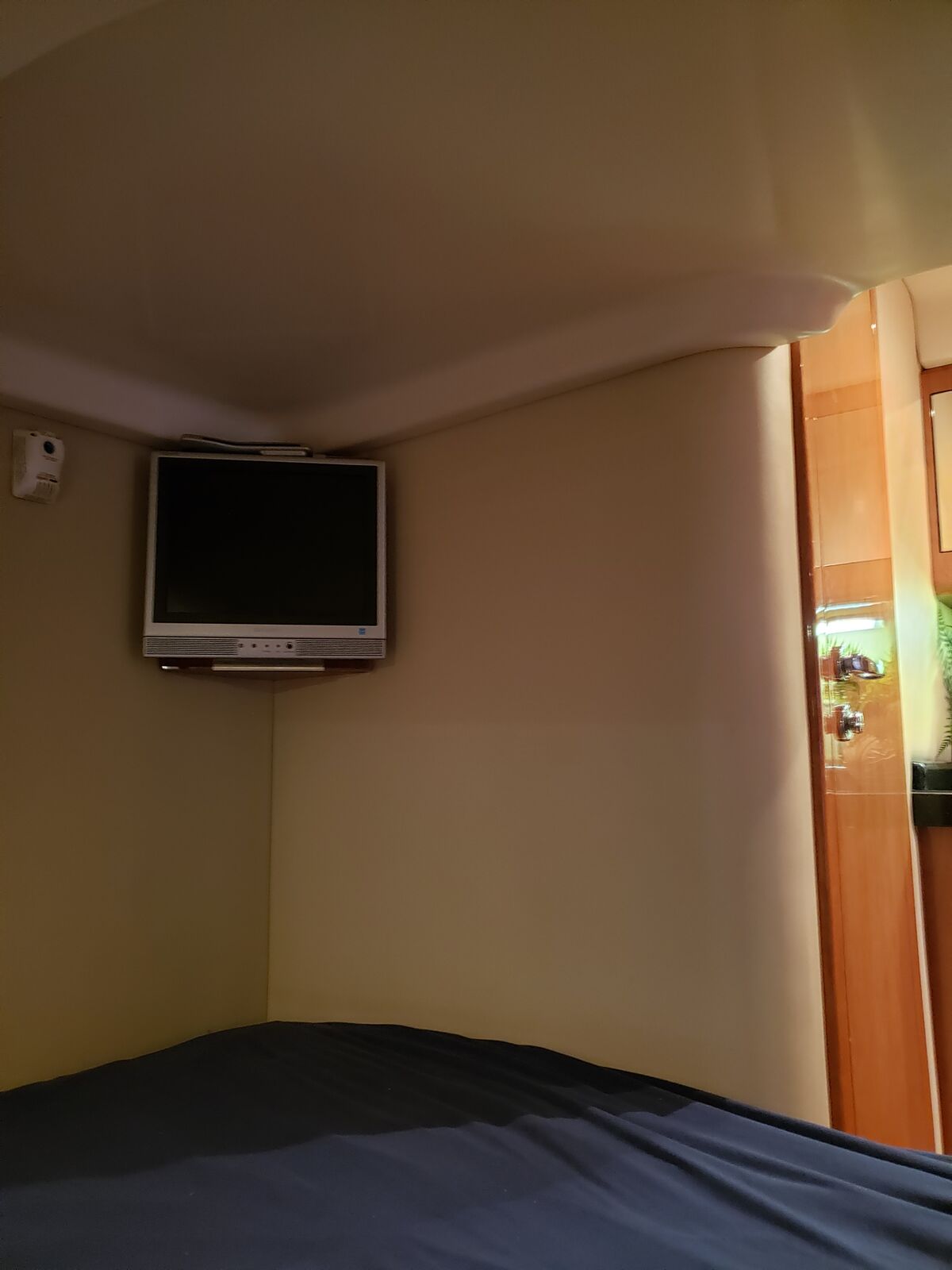 CORIAN COUNTERTOPS NATURAL CHERRYWOOD FINISHES, KENYON 2-BURNER CERAMIC GLASS ELECTRIC COOKTOP, MULTI USE CONVECTION GRILL MICROWAVE OVEN, AC/DC REFRIGERATOR/FREEZER. SURROUND SOUND ENTERTAINMENT. 9 FT U-SHAPED DINETTE SOFA THAT CONVERTS TO A SLEEPER. TWO PRIVATE STATEROOMS WITH THEIR OWN TELEVISION. MASTER HAS A QUEEN V-BERTH AND GUEST HAS 2 TWINS THAT CONVERT TO A FULL. BEDROOMS HAVE THEIR OWN SEPARATE HEADS WITH A VACUFLUSH TOILET, SHOWER AND SINK. AIR CONDITIONING TO SLEEP IN COMFORT.
