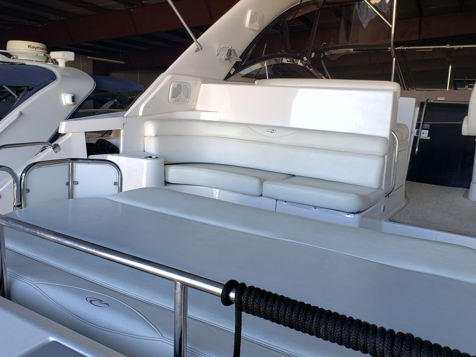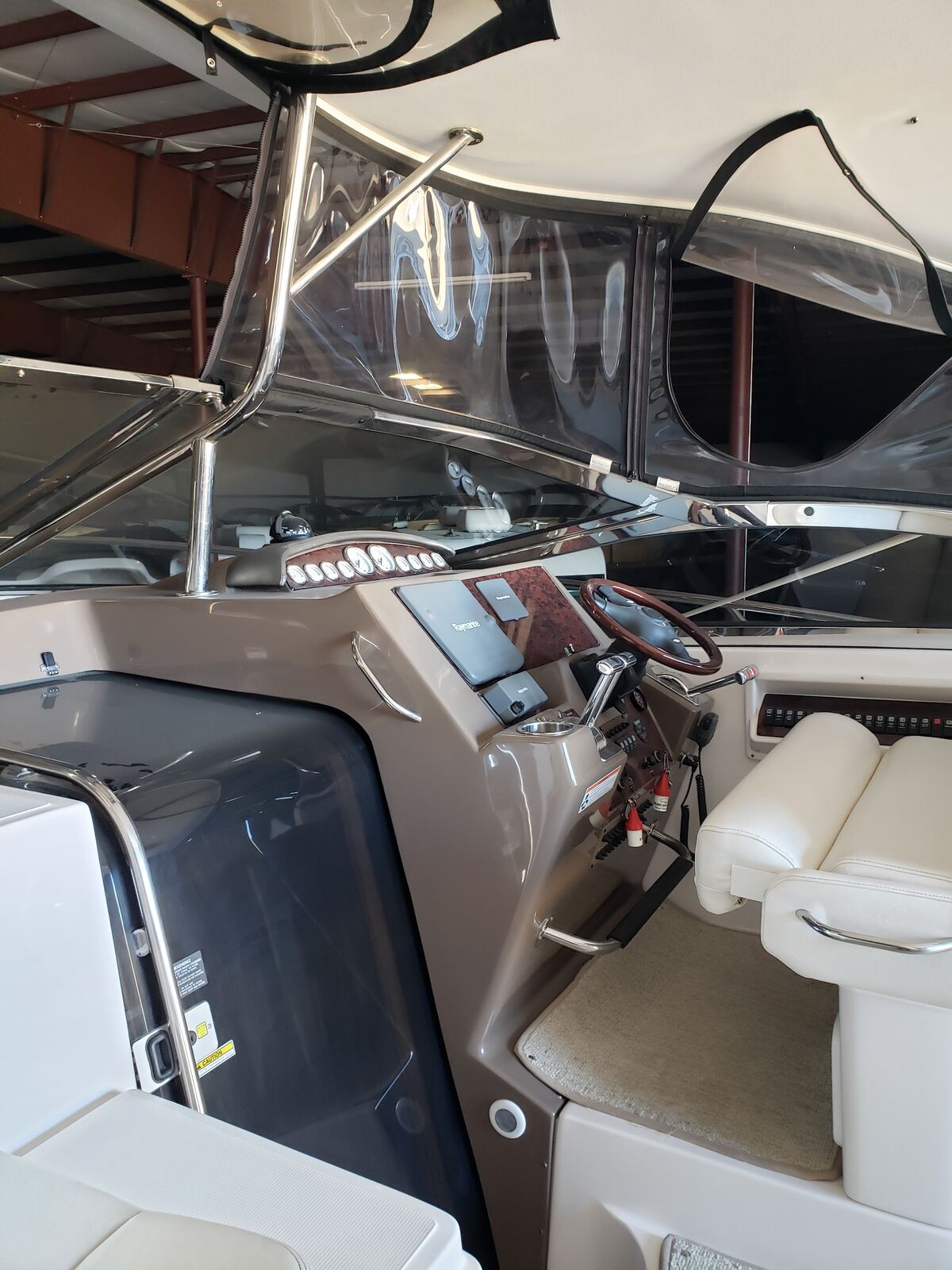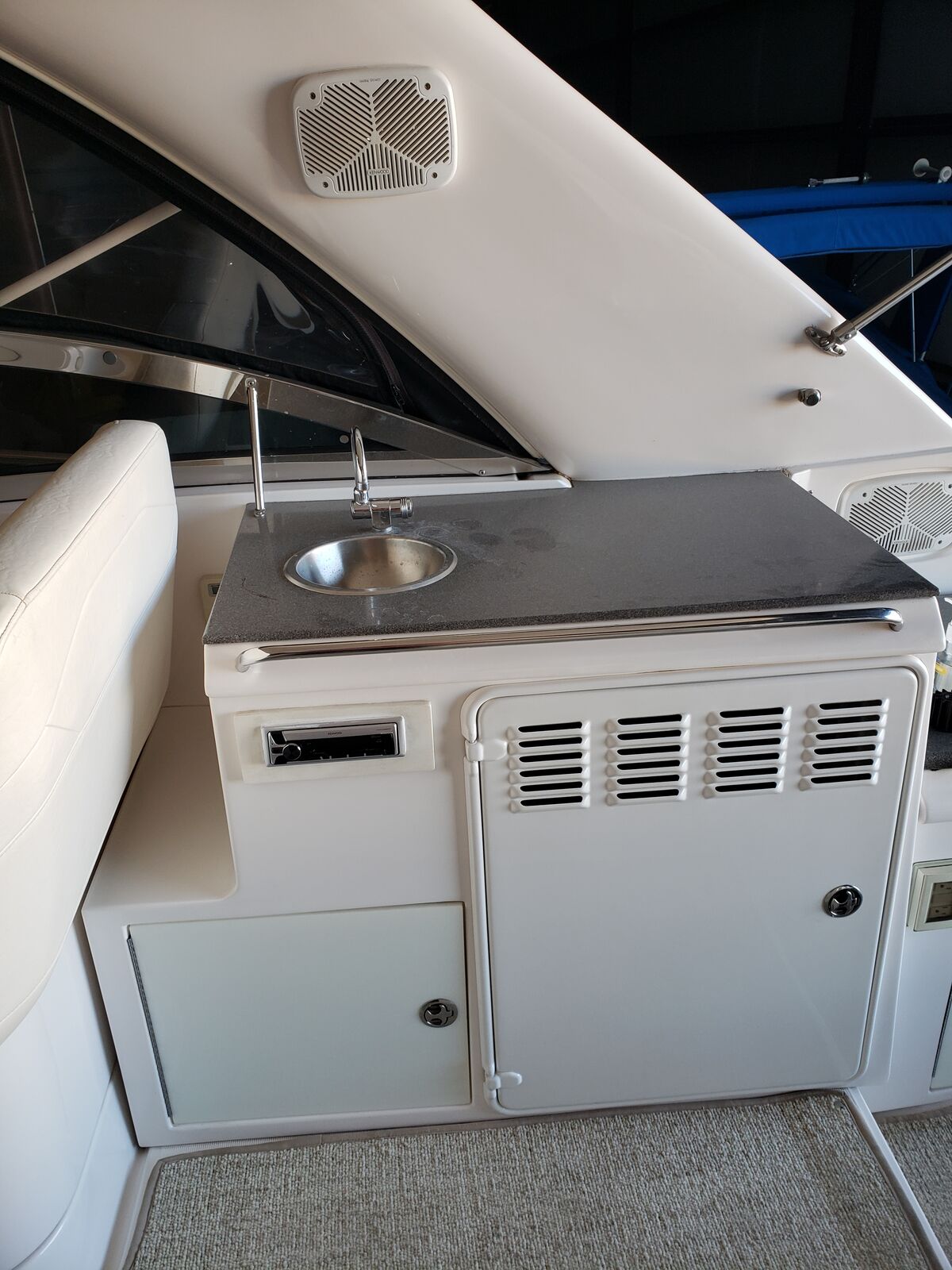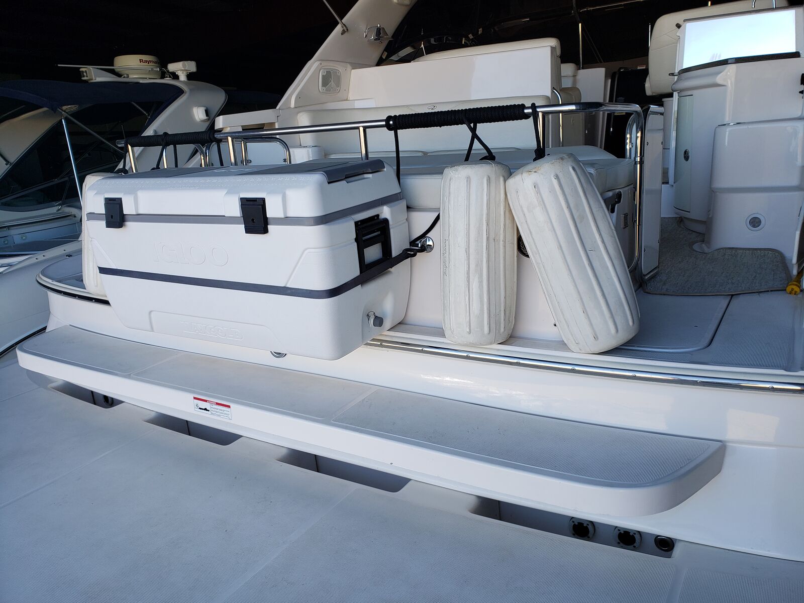 EXTENDED FIBERGLASS SWIM PLATFORM WITH LADDER. HOT AND COLD SHOWER/WASHDOWN, SNAP- IN CARPET, WET BAR WITH BUILT IN GAS GRILL. U-SHAPED DINETTE SEATING, DOUBLE CAPTAINS BENCH SEAT & AFT BENCH & SUNPAD WITH STORAGE. EISENGLASS ENCLOSURE. BOW SUN PADS WITH FLIP UP BACKRESTS & SUN COVERS. BOW PULPIT & ELECTRIC WINDLASS.