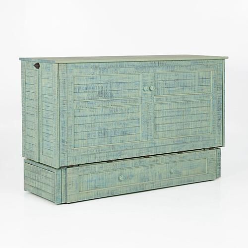 VenmoFull size murphy bed that trifolds to cabinet. Bottom drawer for blanket storage. Side tables flip up/down and there are charging ports available for electronics. Comes with two mattresses, one plush memory foam.