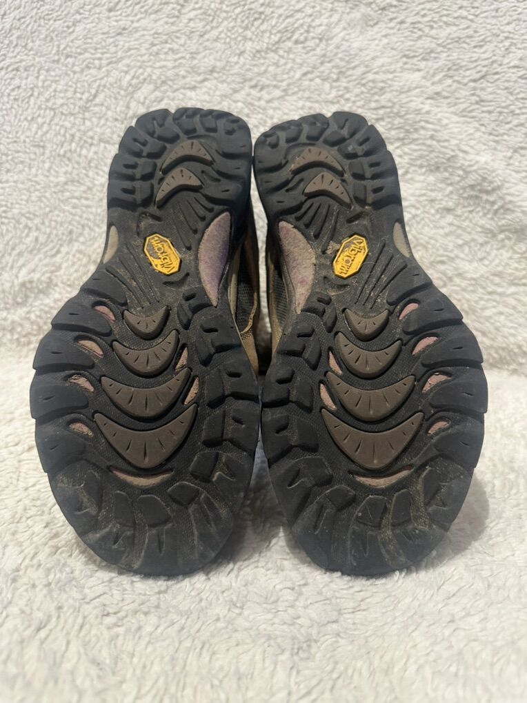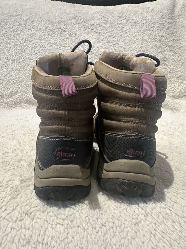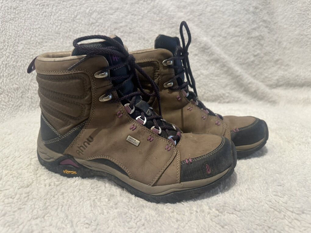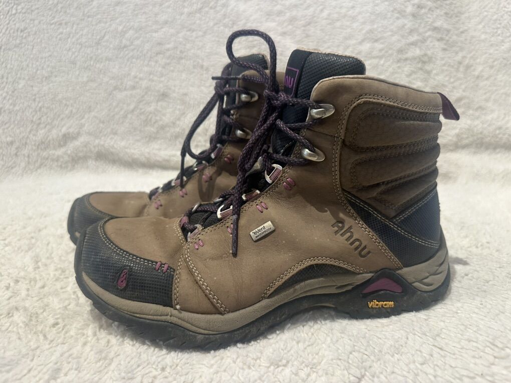 Ahnu (made by Teva) women’s size 6.5 beige leather and textile with black and purple trim waterproof mid hiking boots. These are very lightweight. They do have a couple spots on the toe area. See photos for details. I take cash or Venmo, but cash is preferred. Text is best. 801-201-4446. Check out my other ads for additional sizes and styles.
