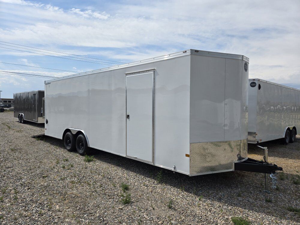 ----------------------INCLUDED UPGRADES------------------------- ROAD FORCE MODEL. RFV8524T3 7FT INTERIOR HEIGHT, REAR RAMP DOOR WITH 80IN OPENING HEIGHT AND 16IN RAMP EXTENSION, 4 FT. BEAVERTAIL, 78 INCH TALL X 36 INCH WIDE. RV STYLE SIDE DOOR WITH RECESSED STEP , .030 BONDED ALUMINUM EXTERIOR ((( NO SCREWS )) 16IN ON CENTER FRAME ON WALL, FLOOR AND ROOF, RHINO LINED FRAME, FENDERS AND REAR HOOP, TANDOM 5200# DEXTER AXLES, 10 000 GVWR, 222/75 R15. 8 PLY RADIAL TIRES, 3/4 INCH WATER RESISTANT PLEXCORE DECKING ((( SUPERIOR TO PLYWOOD ))) 3/8 INCH WATER RESISTANT PLEXCORE INTERIOR WALL LINER, 2 X LED INTERIOR LIGHTS WITH WALL SWITCH, 4 X 5000# RECESSED D-RING TIE DOWNS, -------------------------STANDARD FEATURES------------‐-------------- V-FRONT BULL NOSE DESIGN BRAKES ON ALL WHEELS, ALL LED LIGHTS, RADIAL TIRES, 1 PIECE ALUMINUM ROOF, AND MORE... COLORS AVAILABLE--CHARCOAL GRAY,, SILVERFROST,, WHITE