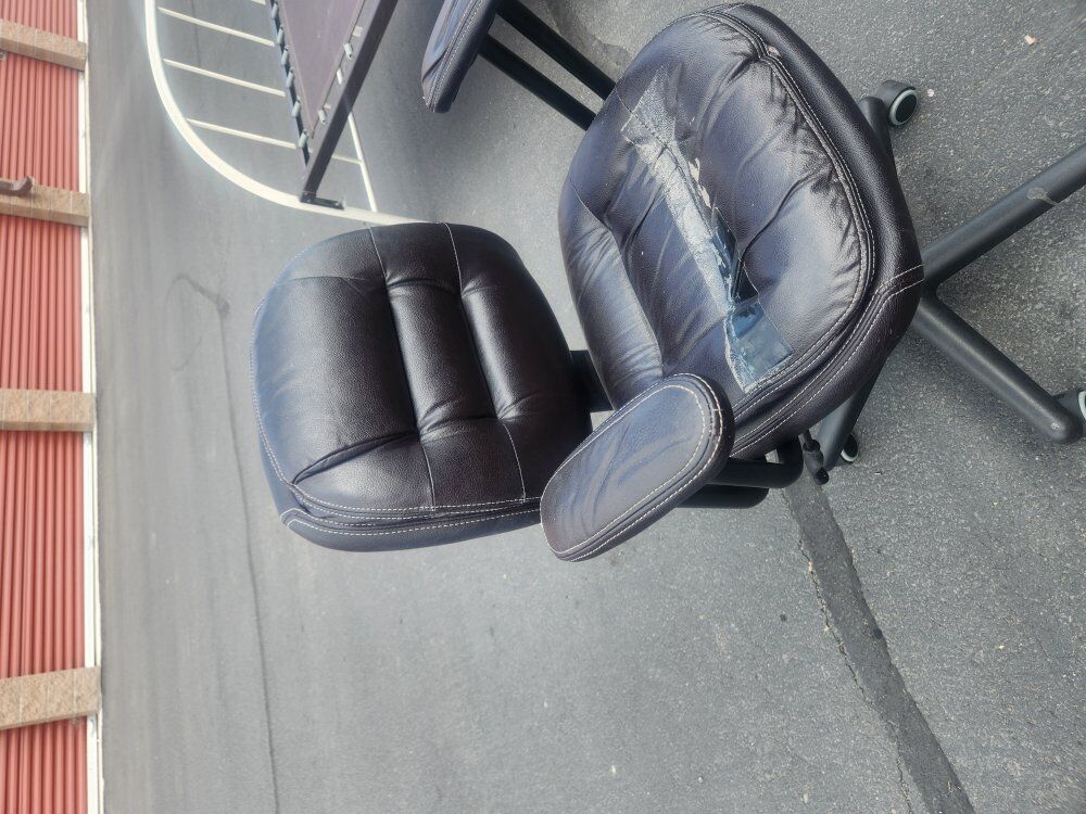 Brown leather office chair. In Good shape. Works great. Fabric on seat is leather. Only concern is it does have a tear in the seat underneath the black tape. The height of a chair is adjustable.